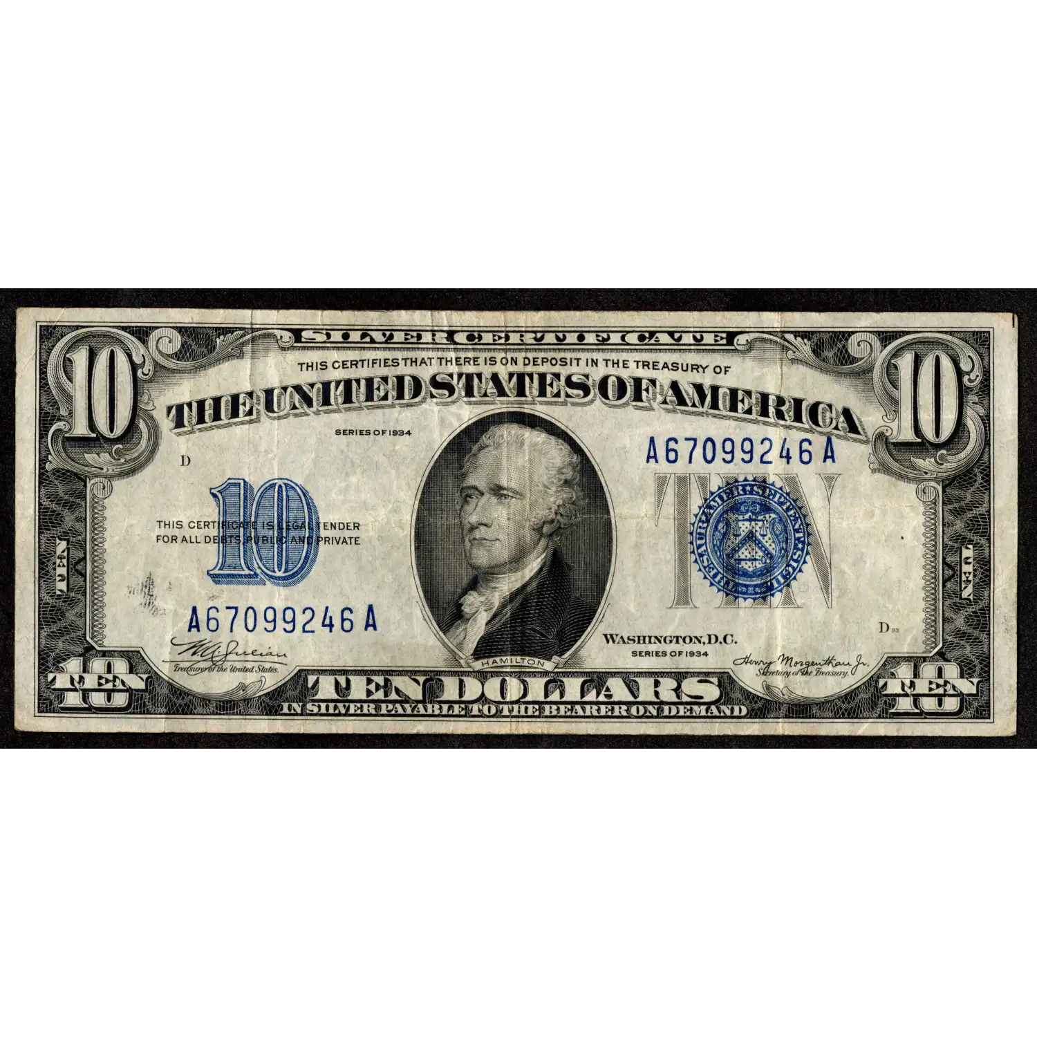 A foundational note for small-size collectors, this $10 1934 Silver Certificate (Fr. 1701) represents the first year the United States issued the $10 denomination in the modern small-size format. With its bold blue seal and classic early layout, it remains a must-have type note for any serious collection.