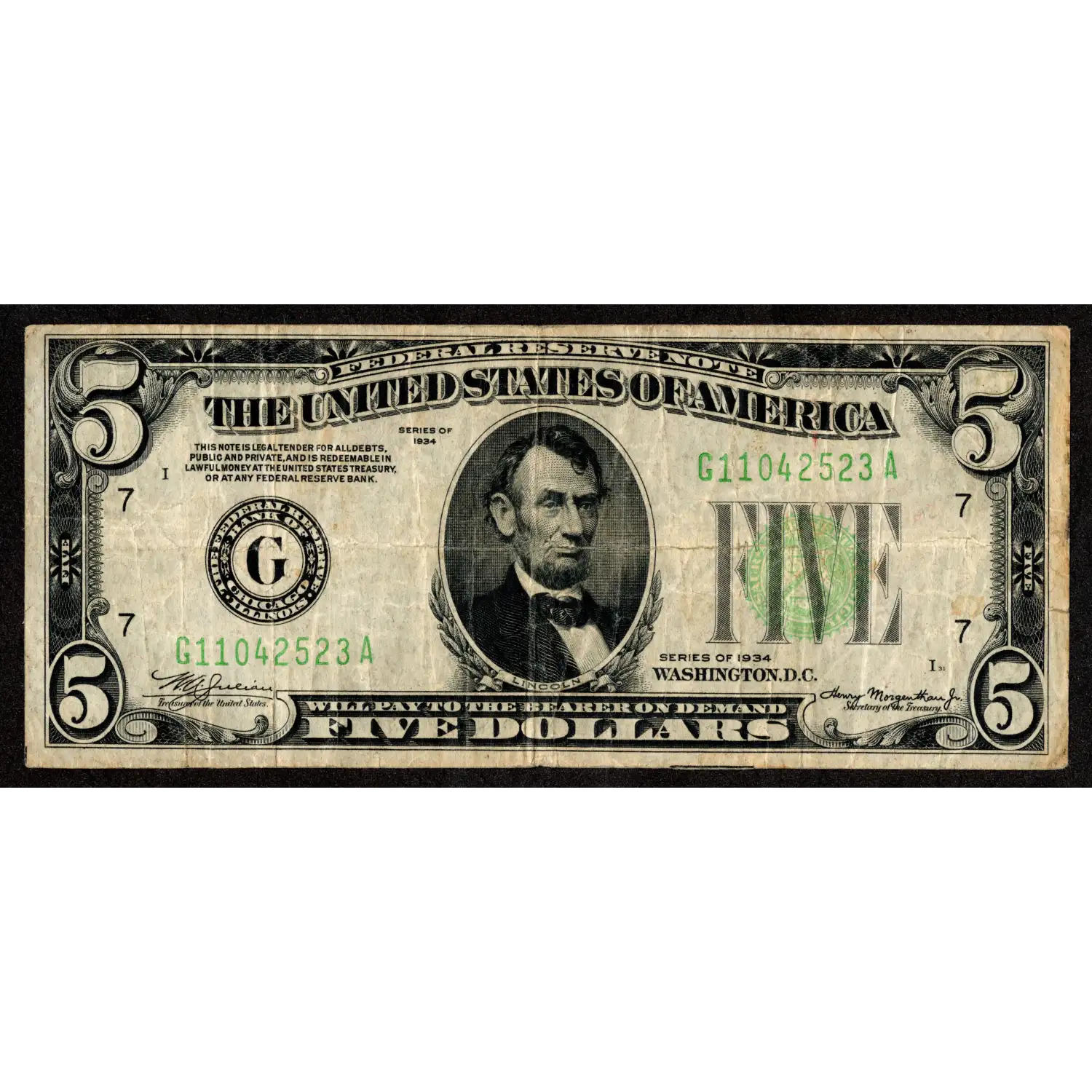 A classic 1934 Chicago $5 Federal Reserve Note, this Fr. 1956-G comes from a time and place forever linked with America’s most infamous underworld figures. Issued in the mid-1930s—right as the city’s Prohibition-era tensions were fading and organized crime was reshaping itself—notes like this circulated through the same streets, speakeasies, theaters, and gambling halls that defined Chicago’s legendary gangster years.