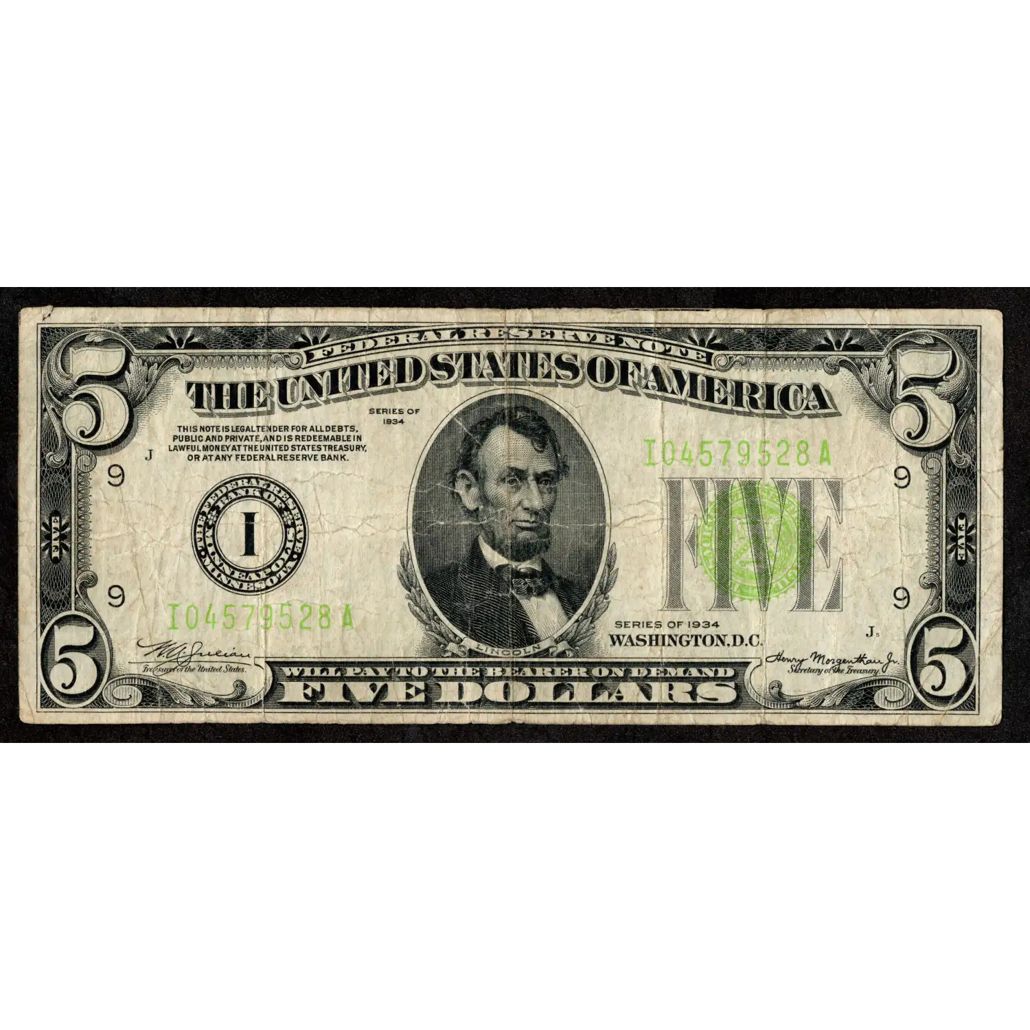 A desirable variety from the 1934 series, this $5 Minneapolis FRN (Fr. 1955-I) features the sought-after Light Lime Green Seal—a bright, easily distinguishable shade prized by specialists of small-size color varieties. LLGS notes were produced in smaller quantities and often stand out immediately when placed beside standard dark-green seal notes.