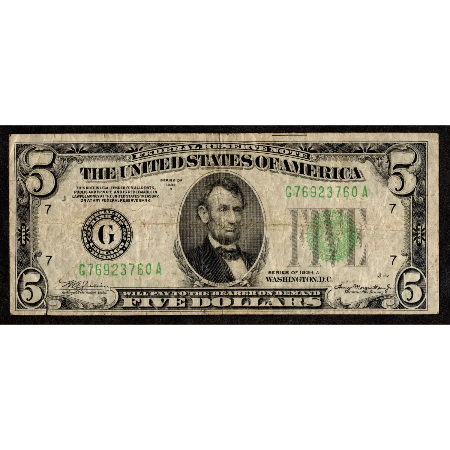 A classic 1934-A Chicago Federal Reserve Note, this piece features the iconic “Legal Tender for All Debts, Public and Private” clause—one of the defining legal statements on mid-20th-century U.S. currency. Issued during a time when Chicago was still buzzing with the aftershocks of its notorious Prohibition-era underworld, notes like this circulated through the same neighborhoods, storefronts, and backroom establishments tied to the city’s legendary gangster history.