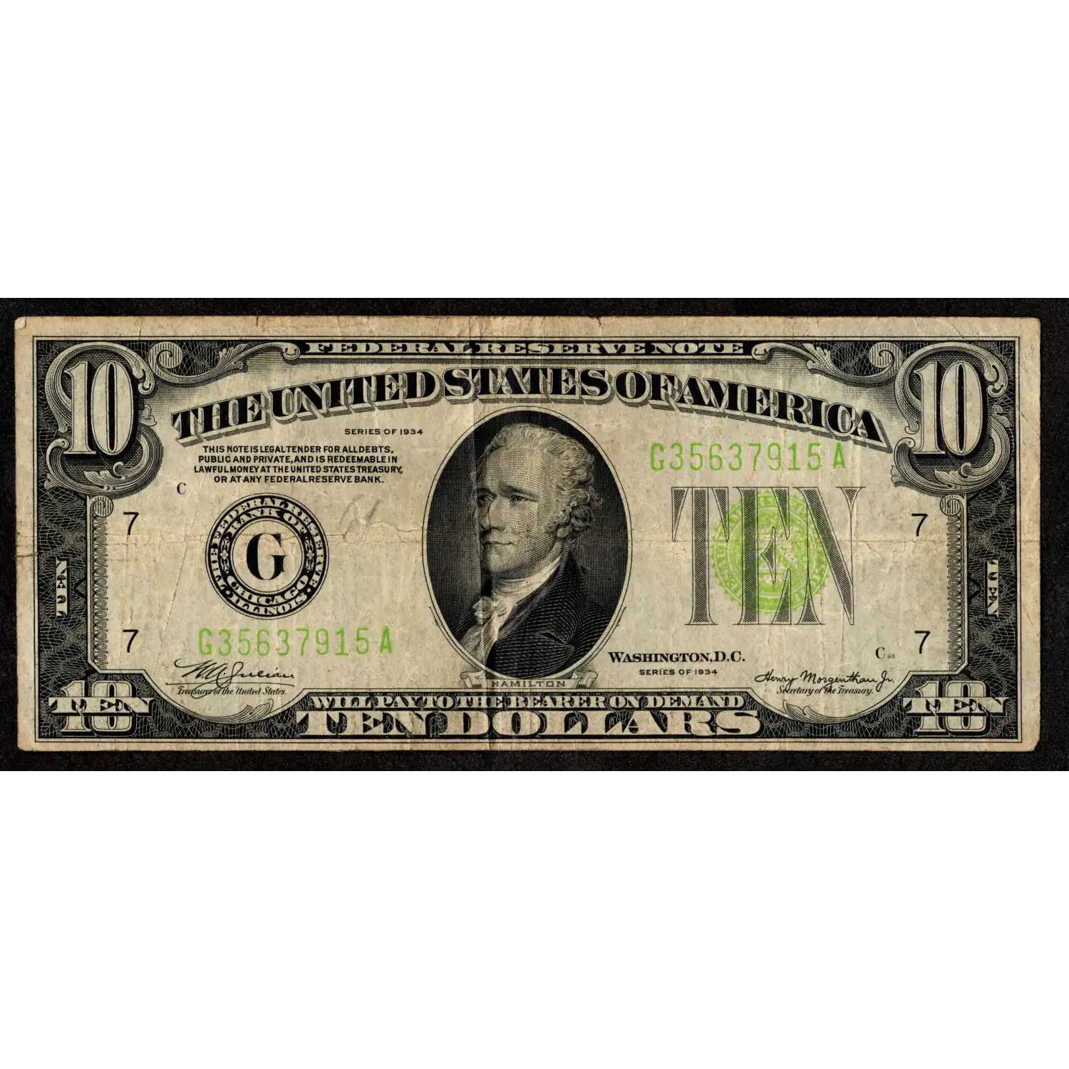 A classic 1934 Chicago $10 Federal Reserve Note, this Fr. 2004-G features the desirable Light Lime Green Seal (LLGS)—a bright, eye-catching seal variety prized by specialists of 1934-series color types. Issued during Chicago’s historic post–Prohibition era, notes like this circulated through the same neighborhoods and businesses that shaped the city’s enduring gangster-era lore.