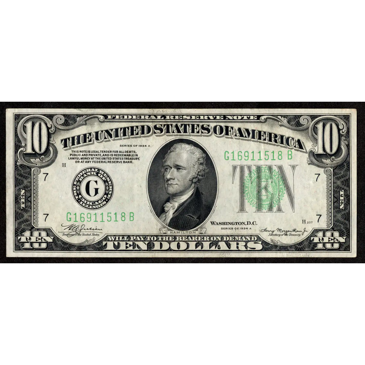 An exceptional example of the 1934-A Chicago $10 Federal Reserve Note, this piece captures the look and feel of currency circulating through Chicago during its storied gangster and post–Prohibition years. The note features the classic green Treasury seal, bold district markings, and the early-design layout that makes 1934-series FRNs so collectible.