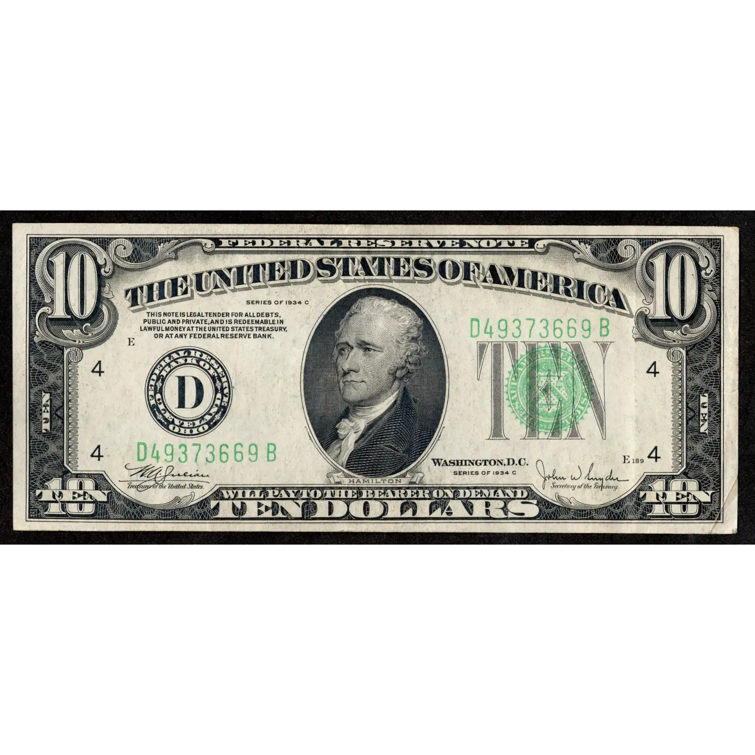A stunning 1934-C Cleveland $10 Federal Reserve Note, this Fr. 2008-D features the classic early small-size design along with the historic “Legal Tender for All Debts, Public and Private” clause boldly displayed on the face. These early-series tens remain popular for their strong visual presence and Depression-era appeal.