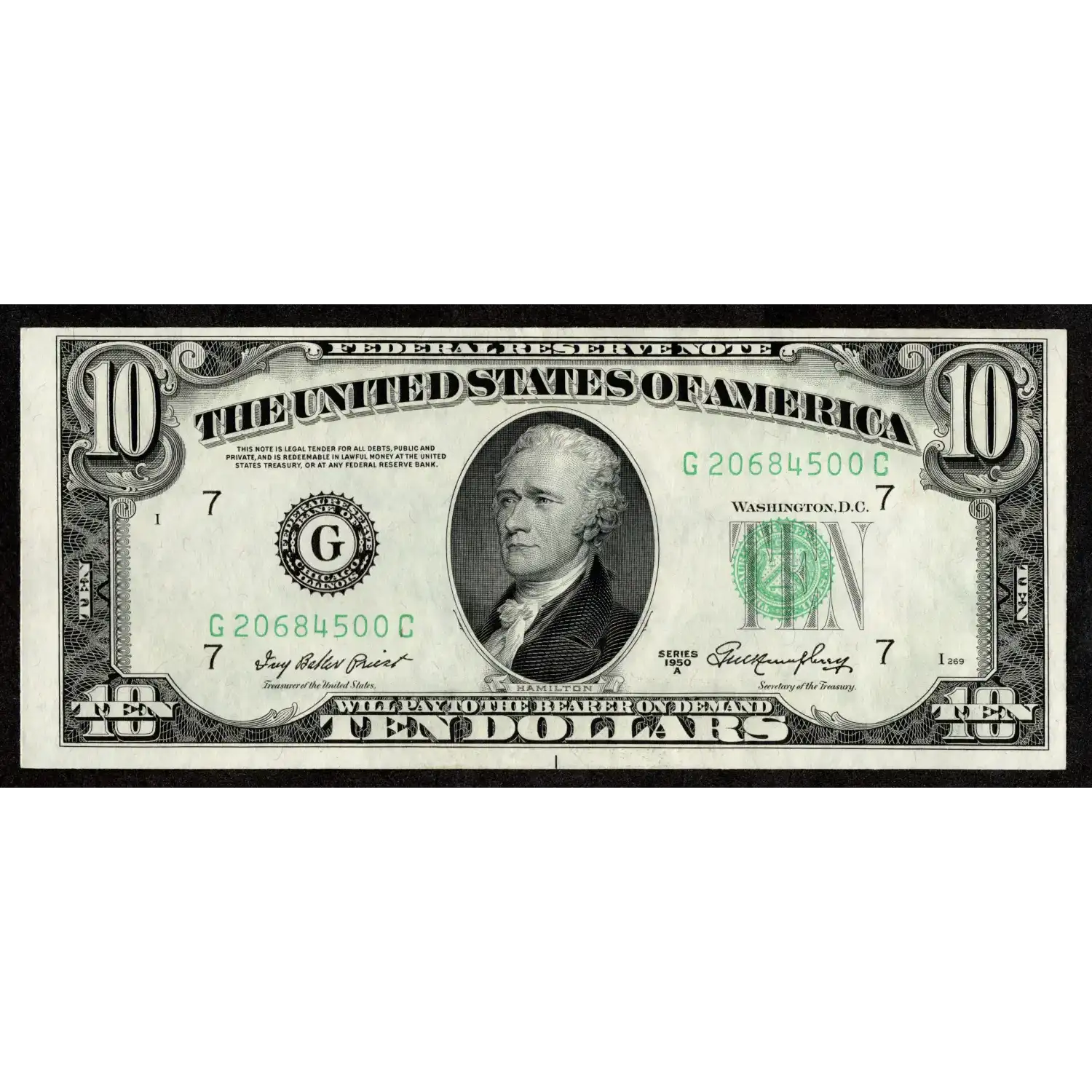 A crisp, high-grade example of the classic 1950-A Chicago $10 Federal Reserve Note, this Fr. 2011-G features the traditional small-head Hamilton portrait and the beloved old-design layout used for mid-century tens prior to the modern redesigns. Bold green seal, strong district markings, and timeless styling make this note an ideal type piece.