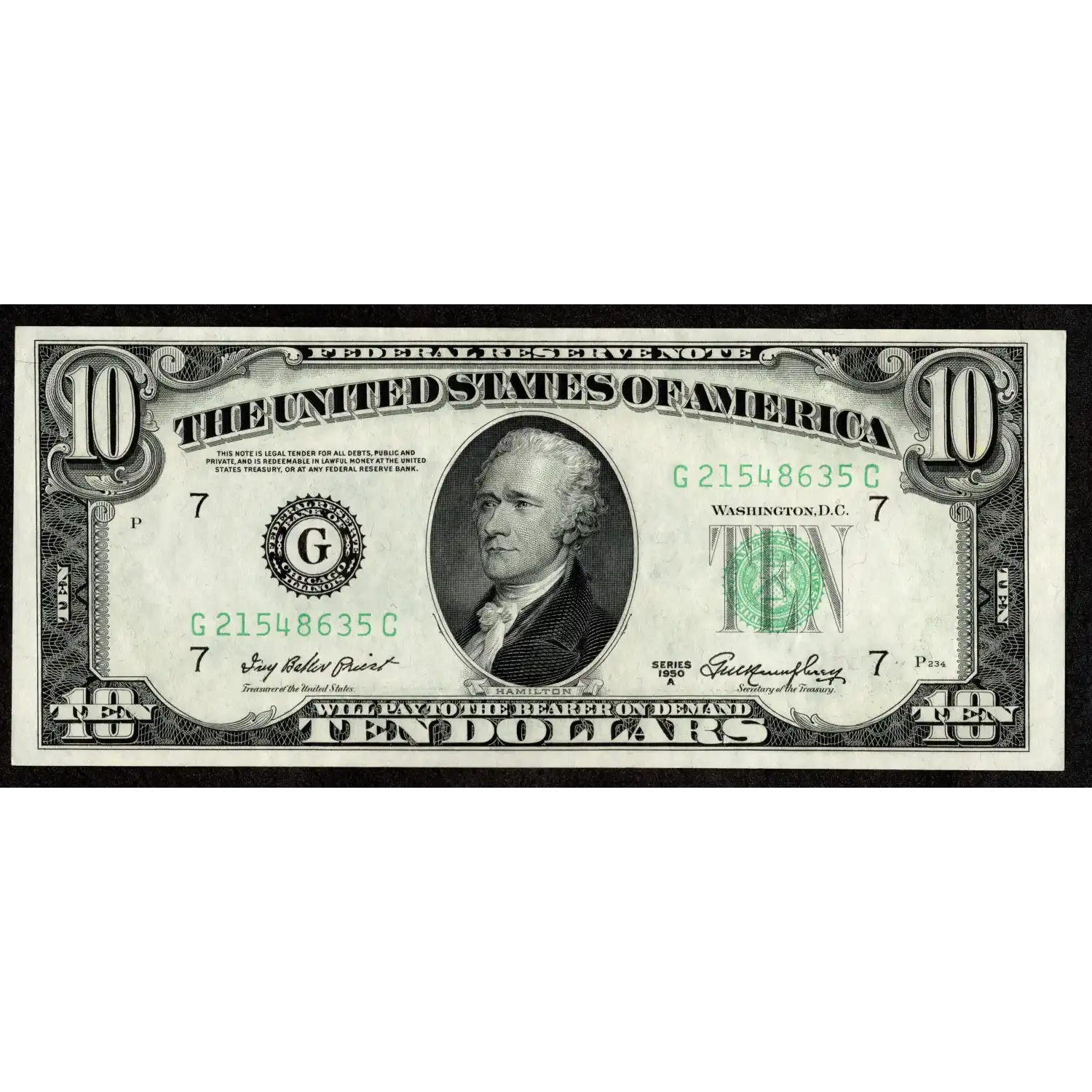 A crisp, high-grade example of the classic 1950-A Chicago $10 Federal Reserve Note, this Fr. 2011-G features the traditional small-head Hamilton portrait and the beloved old-design layout used for mid-century tens prior to the modern redesigns. Bold green seal, strong district markings, and timeless styling make this note an ideal type piece.
