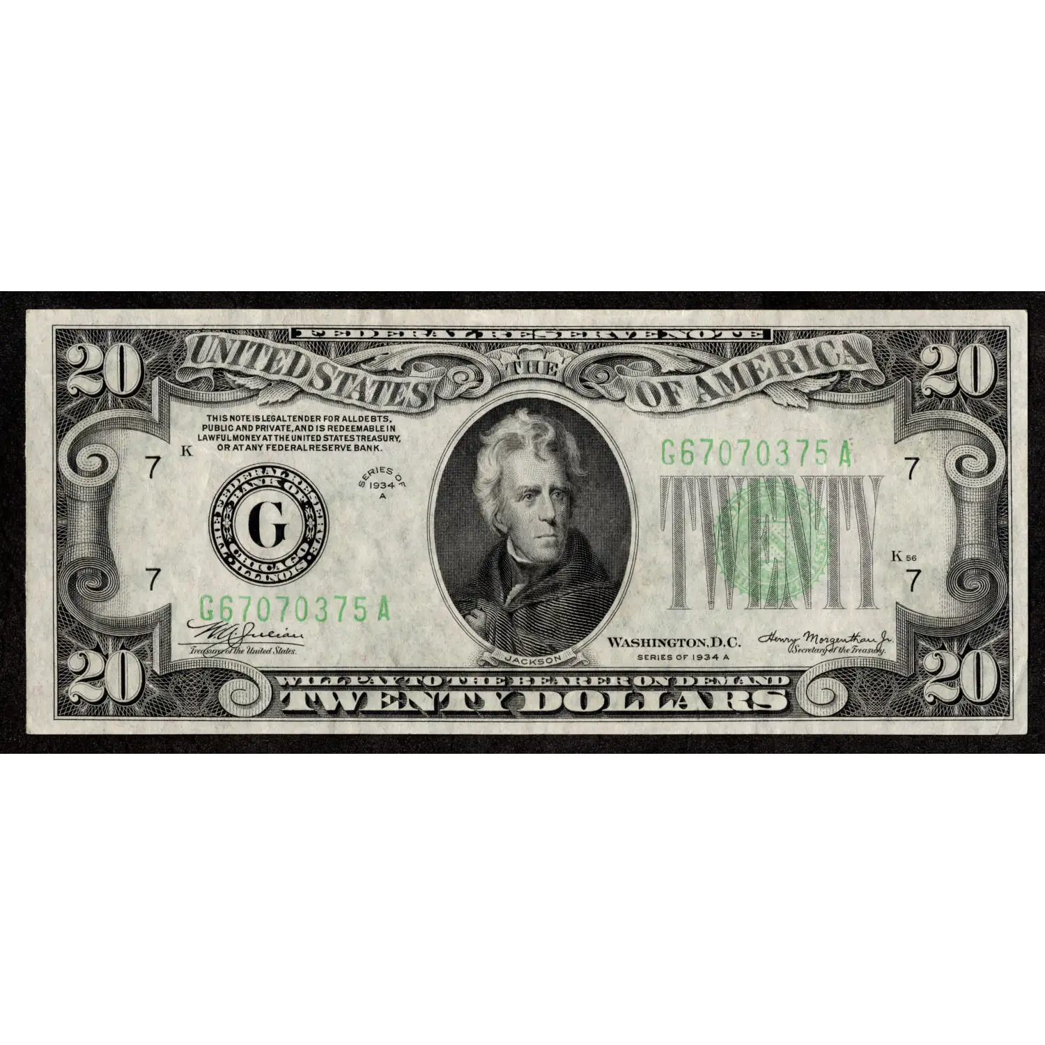 A crisp, high-end example of the 1934-A Chicago $20 Federal Reserve Note, this Fr. 2055-G features bright paper, strong embossing, and bold overprints—everything you expect from a Choice Extremely Fine to Choice About Uncirculated early-design twenty.
