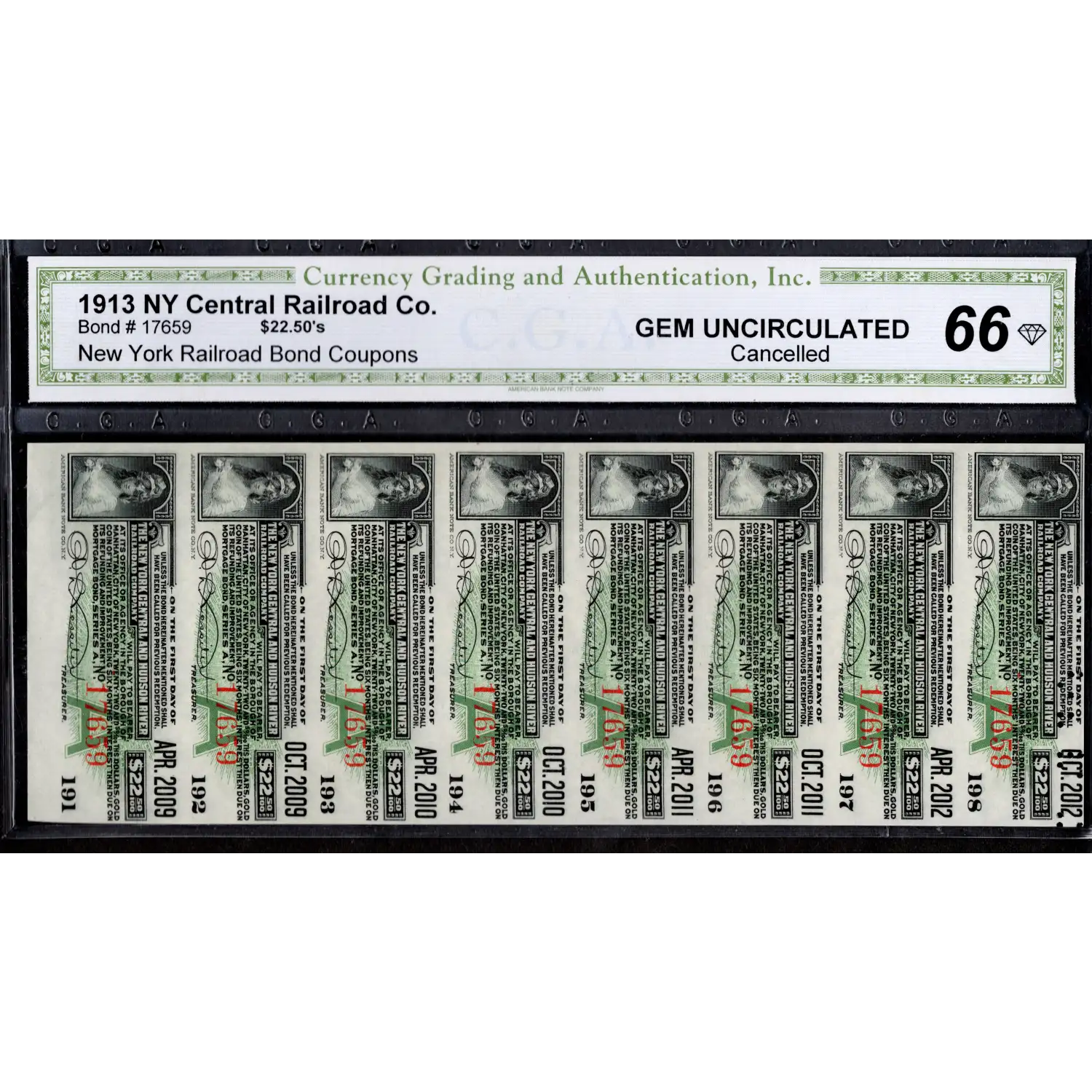 Offered here is an original uncut strip of eight (8) bond coupons from a 1913 New York Central and Hudson River Railroad Company bond, bearing serial number 17659. Each coupon represents a scheduled interest payment, with redemption dates occurring every six months on the first day of the month, spanning April 2009 through October 2012 .
