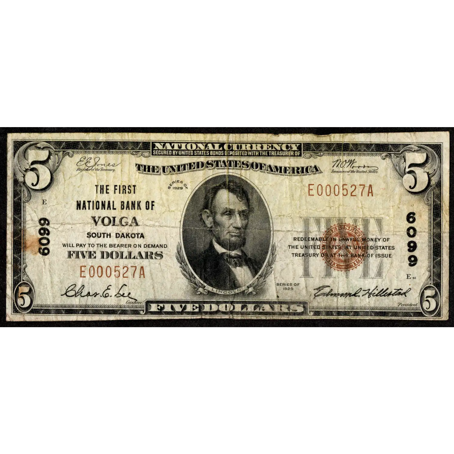 The only type and denomination issued by this tough Brookings County bank in small size, this is an evenly circulated $5 and it is one of just nine notes in the census. The last time this charter number crossed the auction block was in July 2025 when a PMG Very Fine 20 brought $1800 in a Heritage Sale.