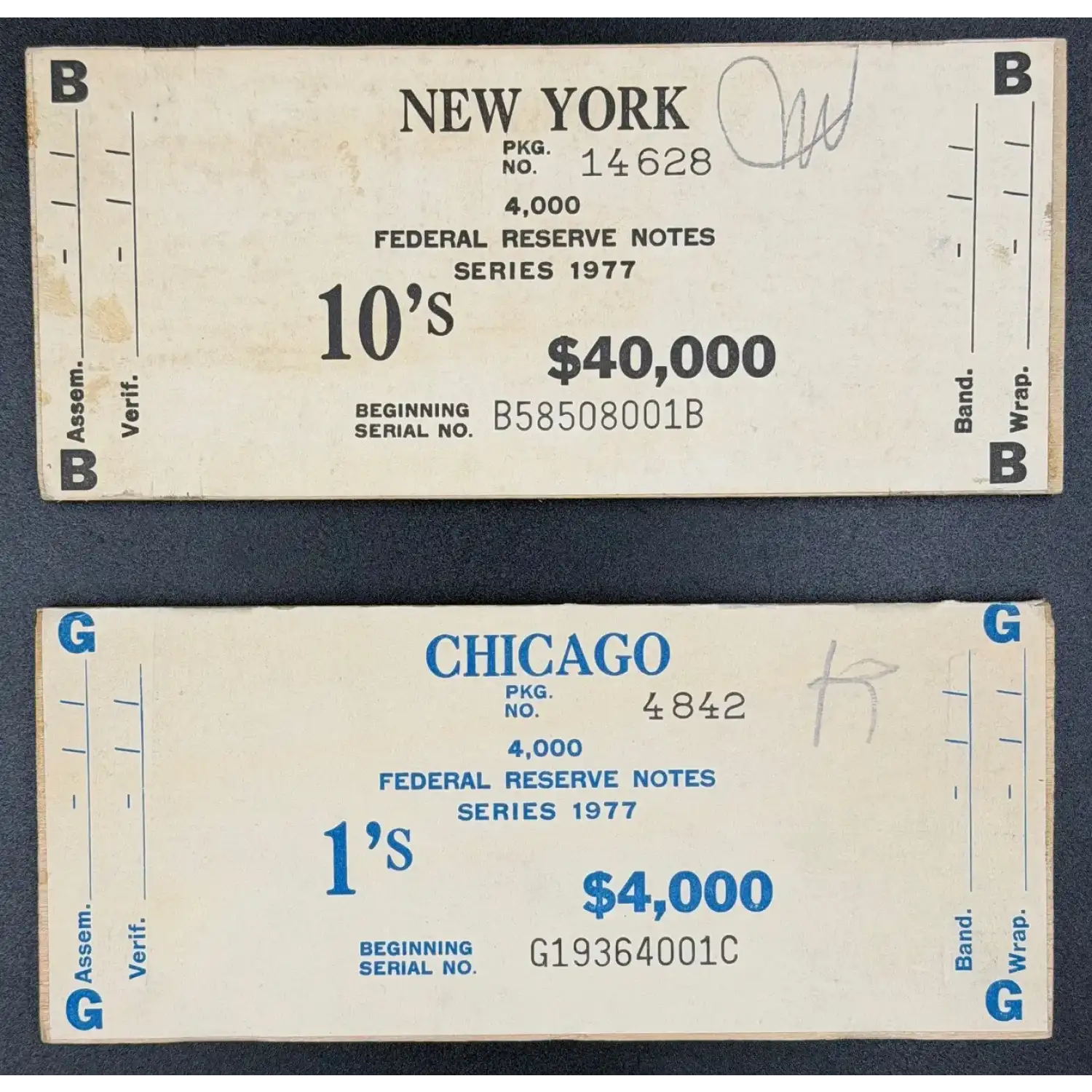 Each label displays key production information, including the beginning serial number of the brick and the issuing Federal Reserve Banks of Chicago and New York, offering a rare, behind-the-scenes look at how U.S. paper money was prepared for shipment.