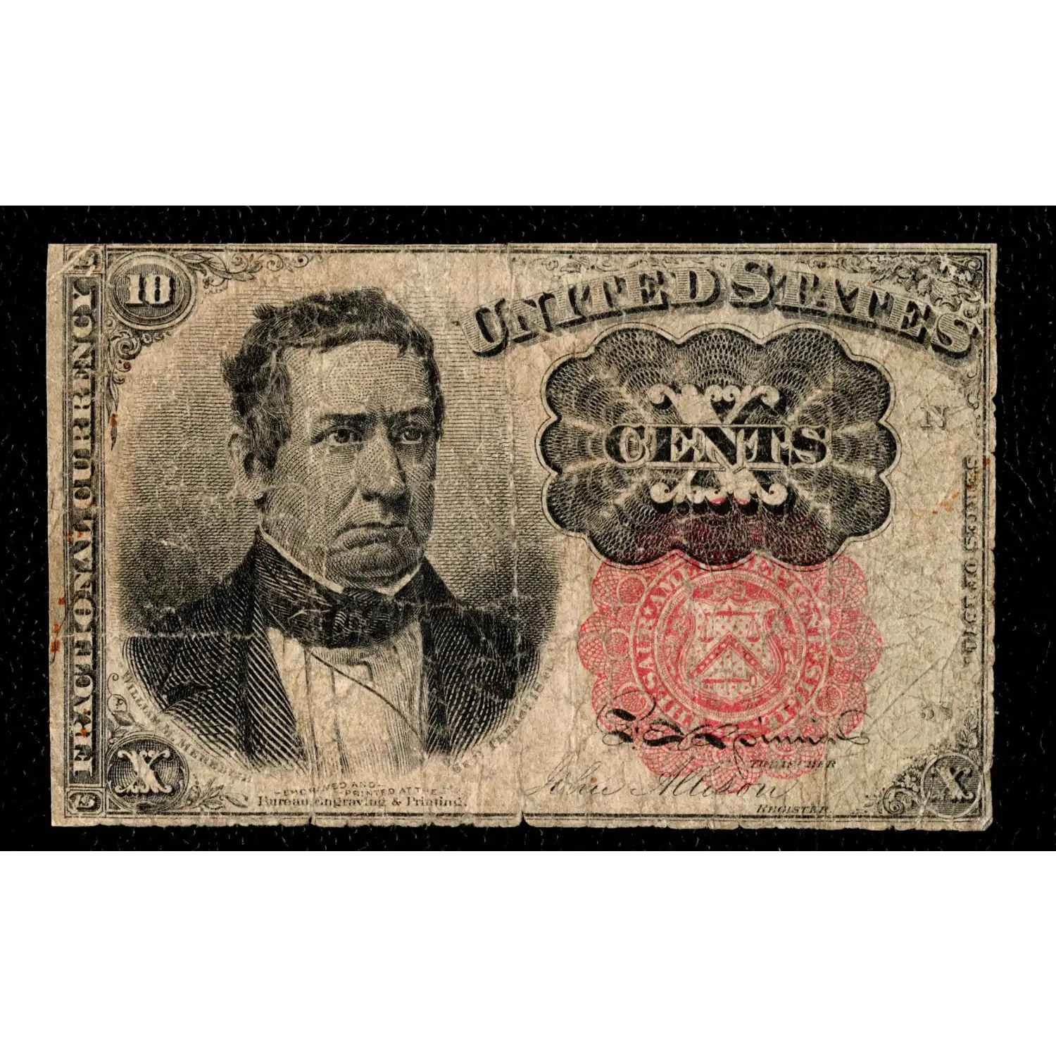 A pleasing example of the Ten Cent Fractional from the Fifth Issue featuring William Meredith, Secretary of the Treasury, 1849- 1850. This note features the long thin key variety and a red treasury seal.