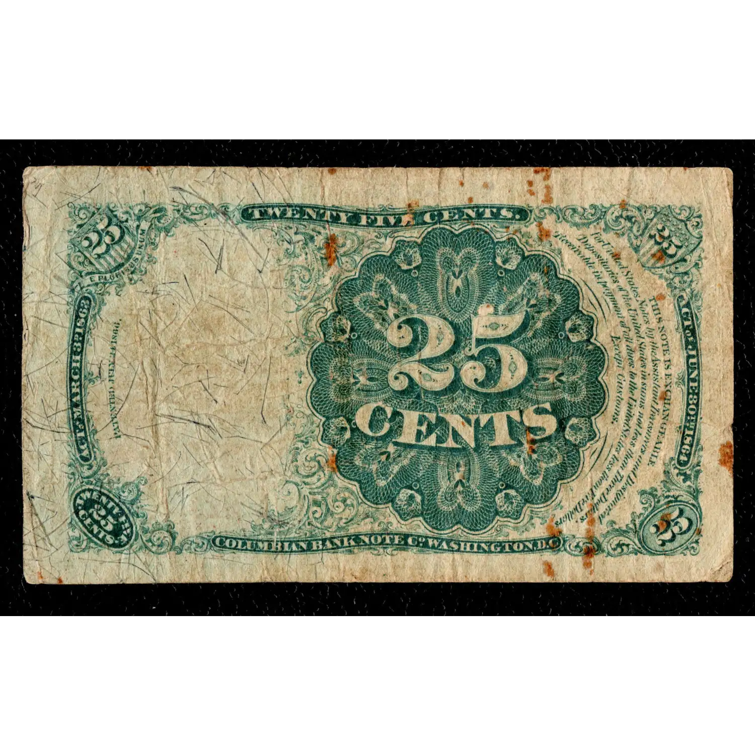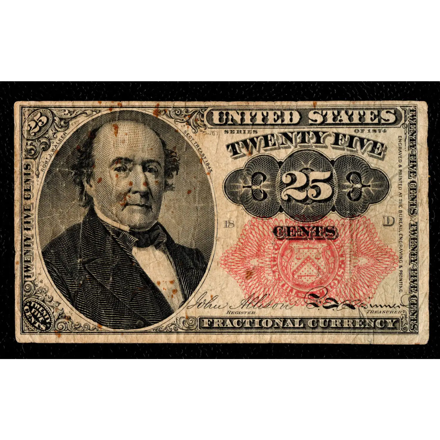 An attractive 25c Fractional from Series of 1874 featuring Robert J. Walker, Secretary of the Treasury from 1845-1849. Within the red treasury seal, this note bears the long, thin key variety and has pleasing eye-appeal. despite a few minor areas of discoloration. As always, please study the provided images to determine if this note would be an ideal addition to your collection.
