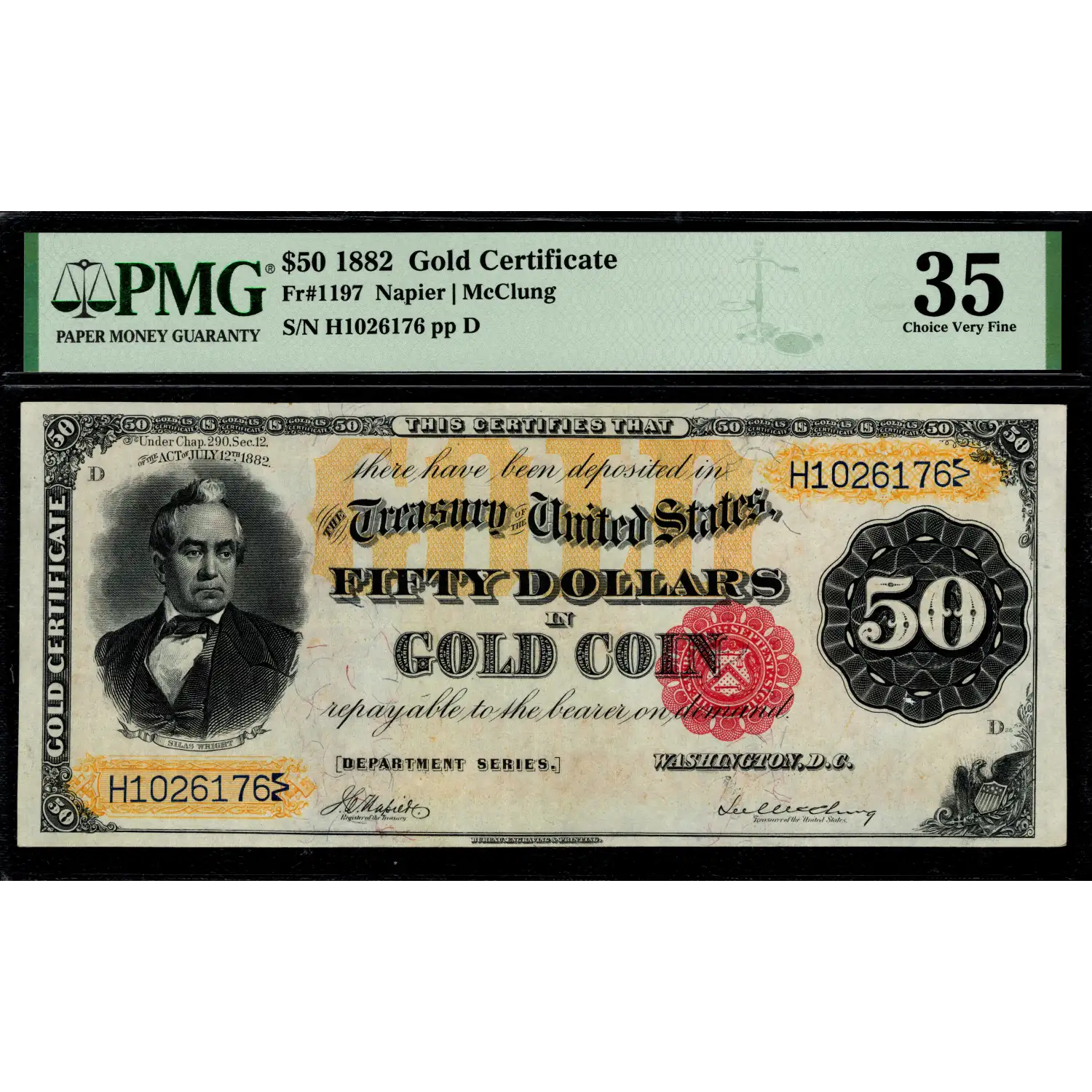 An exceptional note preserved with impeccable eye-appeal. PMG has graded only five pieces above the AU level. This exceptionally well margined example has retained its full colors on both front and back, with a comment of minor restoration that must have only been visible prior to encapsulation. This note has a look that far exceeds its technical grade.