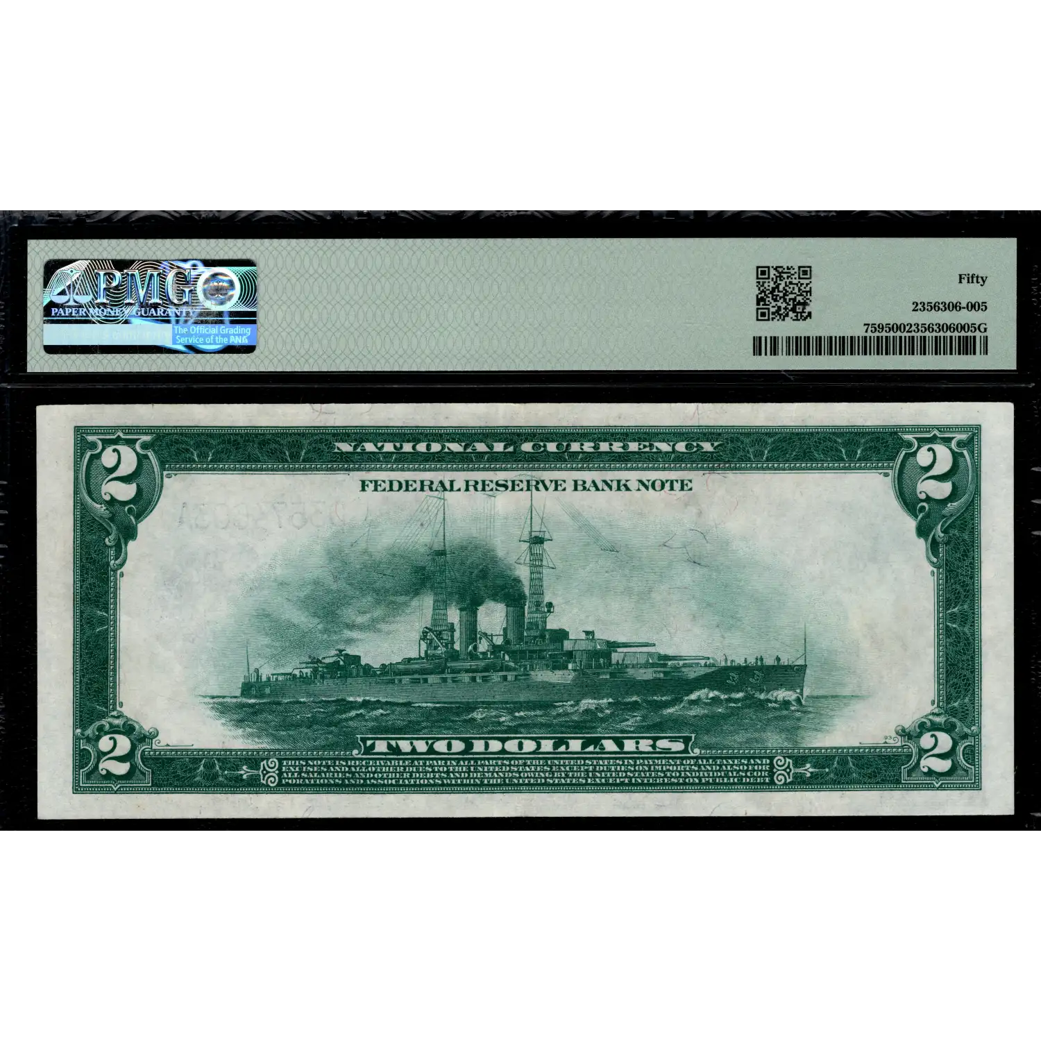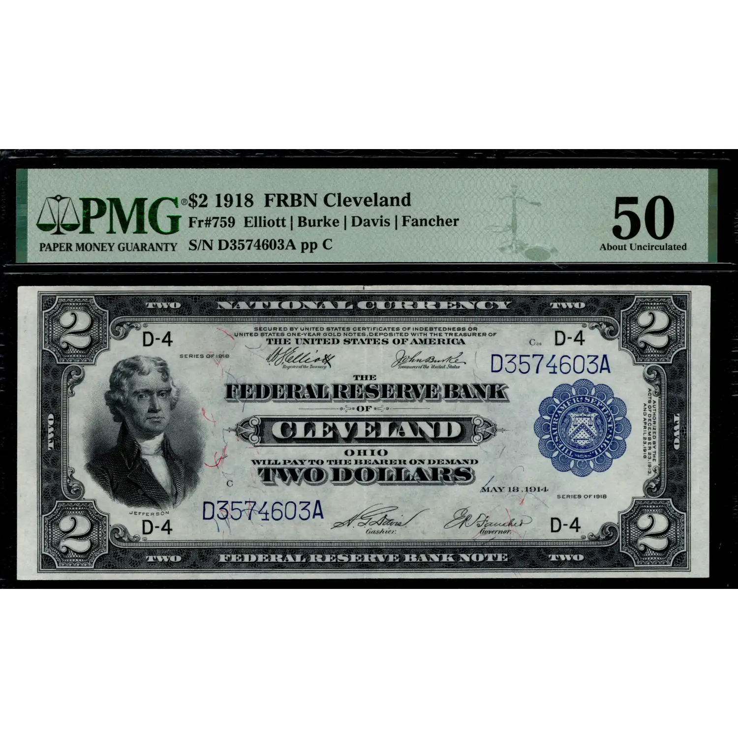 A much scarcer Cleveland Battleship variety, the total census comes to less than 175 notes. It is clearly outnumbered by Fr. 757, with a total well over the 400 mark. This is a very attractive note, with paper surfaces that show all of their original embossing and perfect colors of the inks and paper. There is a single center bend and no other visible handling through the encapsulation which certainly makes this note appear undergraded by several points. Congratulations to the astute collector that buys the note and not the holder on this scarce and stunning Cleveland Battleship.