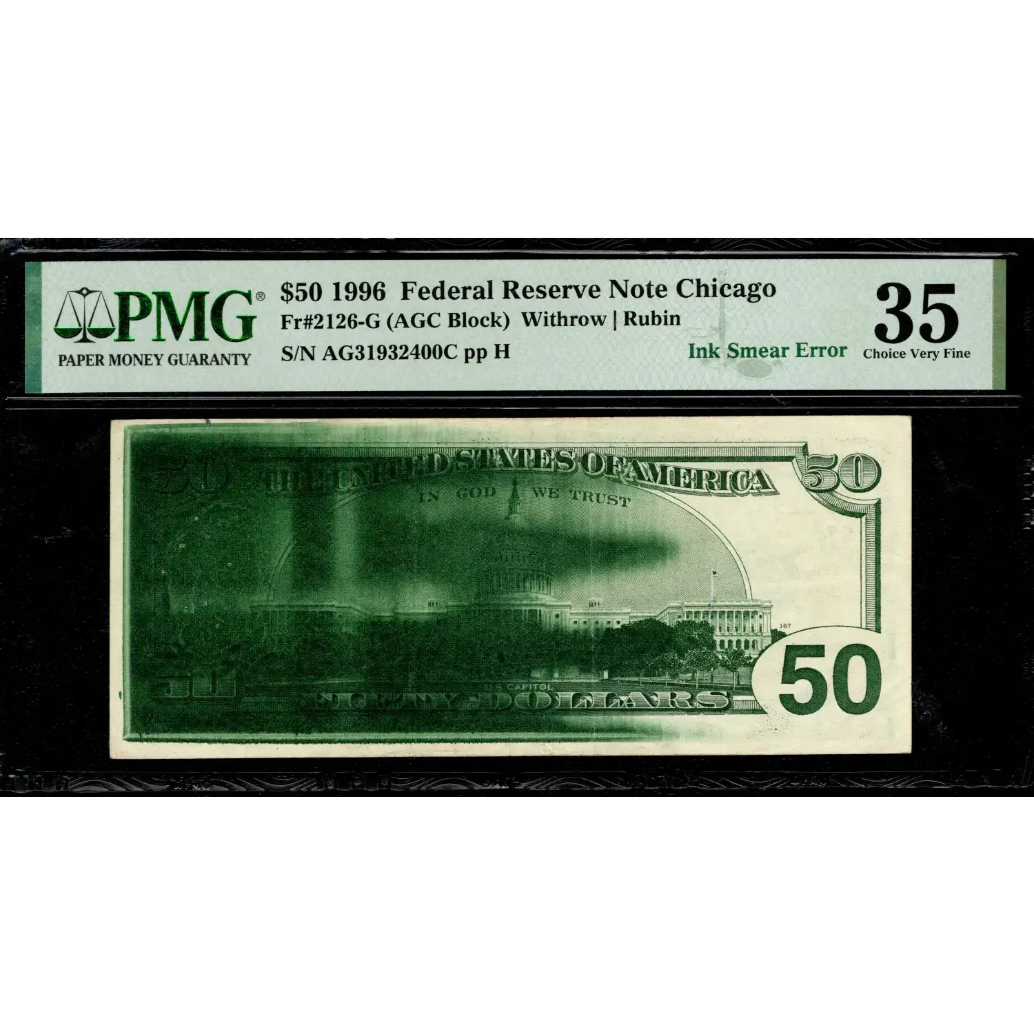 A tough denomination with a dramatic mistake! This Big Head Fifty has a partially flooded plate with horizontal wiper marks present on the back as the excess green ink has obliterated the back design and spans across the U.S. Capitol affecting more than two-thirds of the first/ back printing. An impressive error on any denomination, but to acquire such a dramatic example on a higher and considerably tougher Big Head Fifty will be an impressive addition for a collector. As noted by PMG, there is a small cluster of pinholes on the left end of the note that become visible when the note is backlit, but otherwise remain unobjectionable. It's tough for any problem to supercede this exceptional ink smear, but a little group of pinholes can easily be overlooked on a mistake of this magnitude!