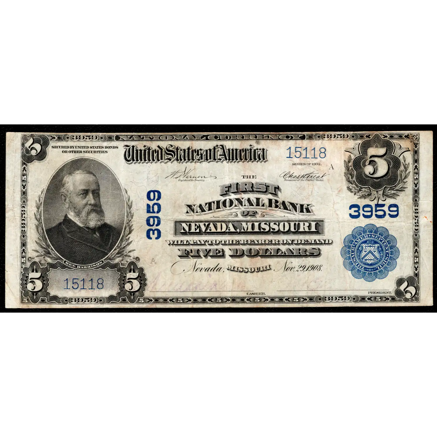 An interesting title as both the city and state are in it. The bank organizers filled out their national bank papers incorrectly and rather than simply putting "Nevada" for the city, they filed "Nevada, Missouri." As such, the incorrect title was approved and printed on paper money. This mistake was later corrected for the series 1929 notes from this Vernon County bank.
