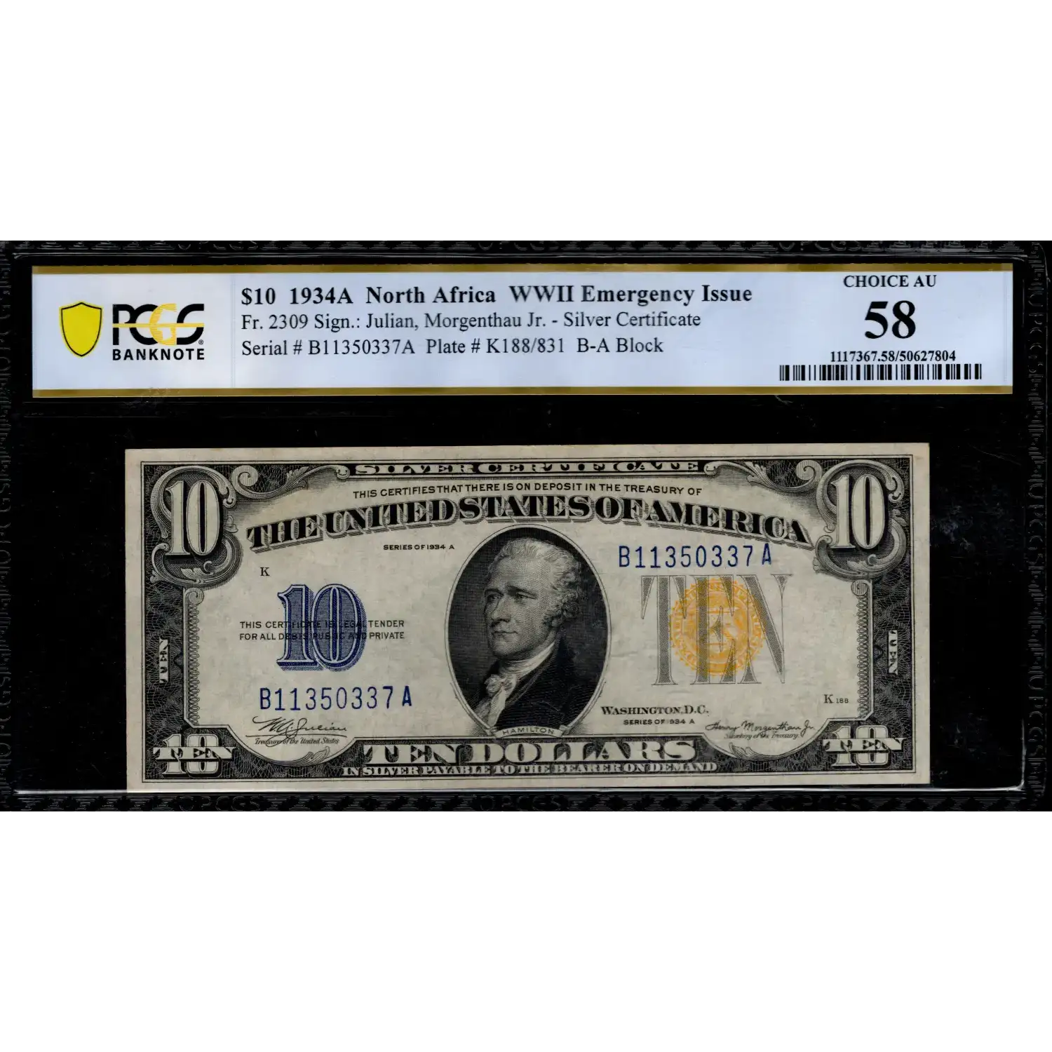 This $10 1934-A North Africa Silver Certificate is part of the special WWII Emergency Issue series printed for U.S. troops operating in the North African and Mediterranean theaters. These notes feature the distinctive yellow Treasury seal—a design chosen so that, if large quantities were captured by enemy forces, the U.S. government could easily identify and invalidate them without disrupting the national money supply.