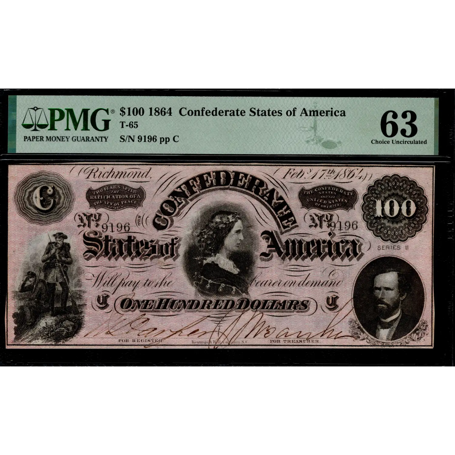 Printed on fully original paper surfaces, this Choice Uncirculated T65 possesses a nearly full frame line and a dusty pink underprint on the face. A colorful blue back with a large "HUNDRED" at center is also observed. PMG comments a single pinhole which could've been easily overlooked on this thin paper as it takes real time to locate it while it's backlit and under magnification. Enjoy an attractive Series II exxample with deep colors and spectacular eye-appeal.