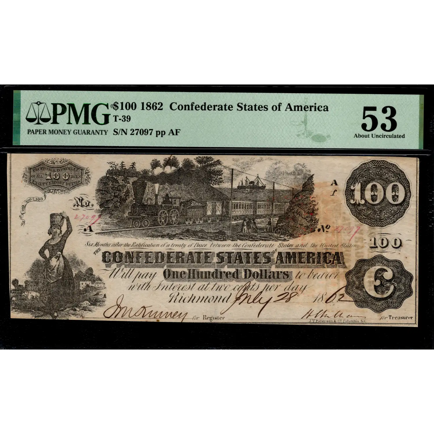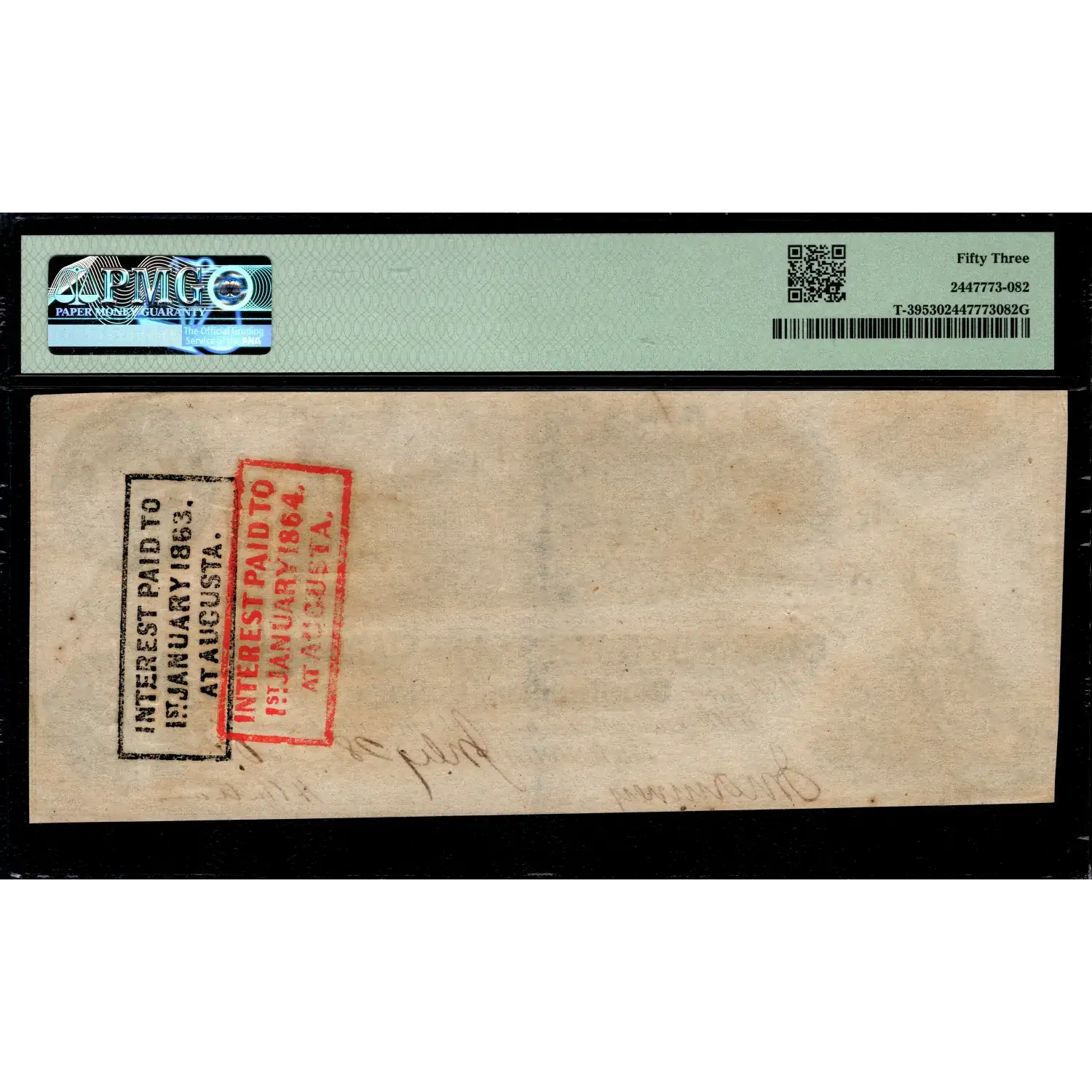 The two Augusta, GA, Interest Paid stamps paying interest to the standard interest payment dates that occurred during the war may partially explain this note's terrific condition. It was likely held by a bank, insurance company, or wealthy individual and never saw circulation, spending the war safely ensconced in a safe or strong box being brought out only to have its interest paid. At some point in nearly the last 165 years, this note picked up some incredibly gentle and limited handling earning it a conservative About Uncirculated 53 grade from PMG. Most impressively, this survivor comes with no negative comments or the less-preferred 'net' designation quite a few survivors have. Enjoy an attractive and problem-free example of a highly-collectible design!