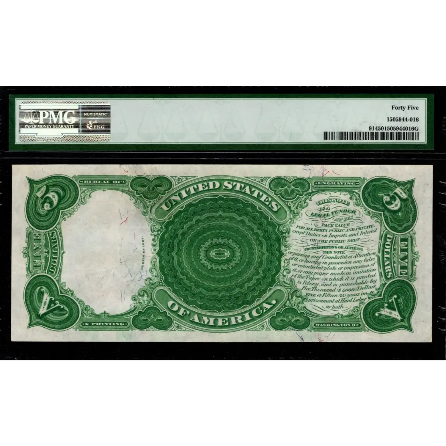 An absolutely gorgeous and seemingly uncirculated example of the iconic $5 1907 Woodchopper! This note faces up wonderfully with strong inks and terrific eye-appeal. On the right side of the back, this note has the popular PCBLIC / Public Engraving Error as it reads "For all debts pcblic and private." A common mistake offered at no premium.