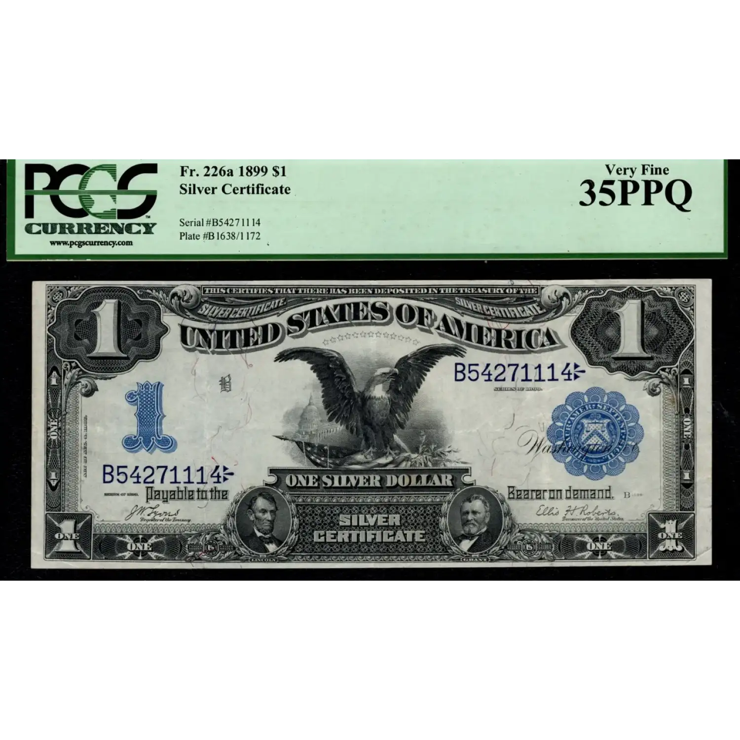 The first Black Eagles have additional visual appeal, as two distinctly different blues were used - one darker blue for the serial numbers, and the other lighter blue for the seal and large "1" counter. Later issues used a single color blue for the entire overprint. It was lighter than these serial numbers, but darker than this seal. This "B" block note is bright, well margined, and only lightly circulated.