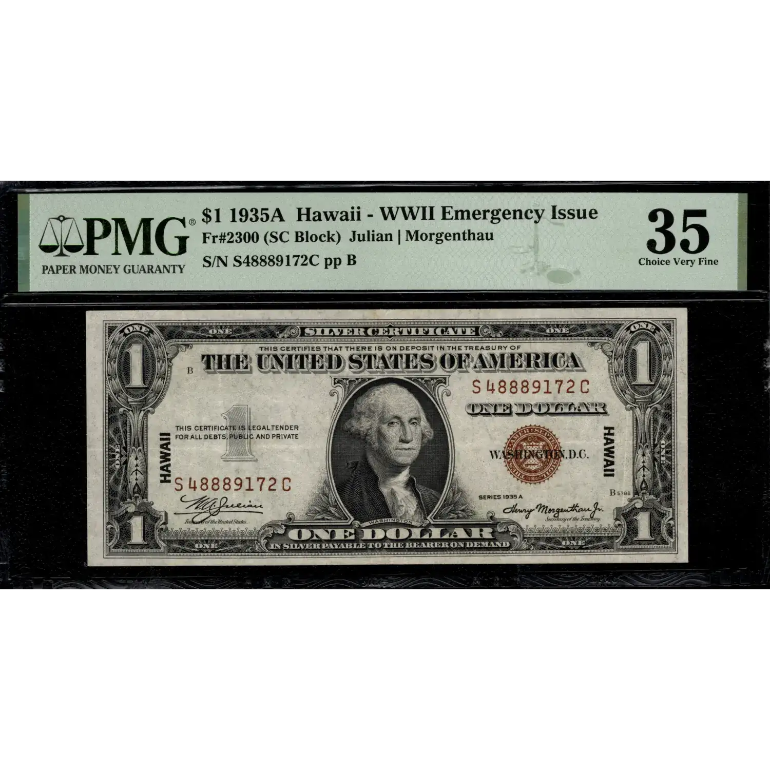 An attractive and affordable opportunity to acquire a WWII Emergency Issue. This note has a bold brown seal and serials which allowed it to be readily demonetized should it have fallen into enemy hands.