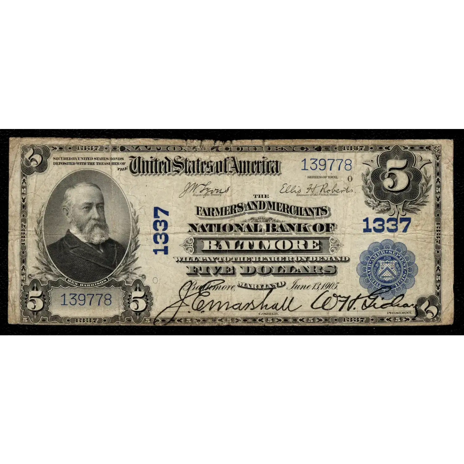 An attractive plain back variety from this double bank name in Baltimore, MD identified by Charter #1337. Dark inks, bold sigs, and a few edge splits make this an affordable and attractive example for a collector.
