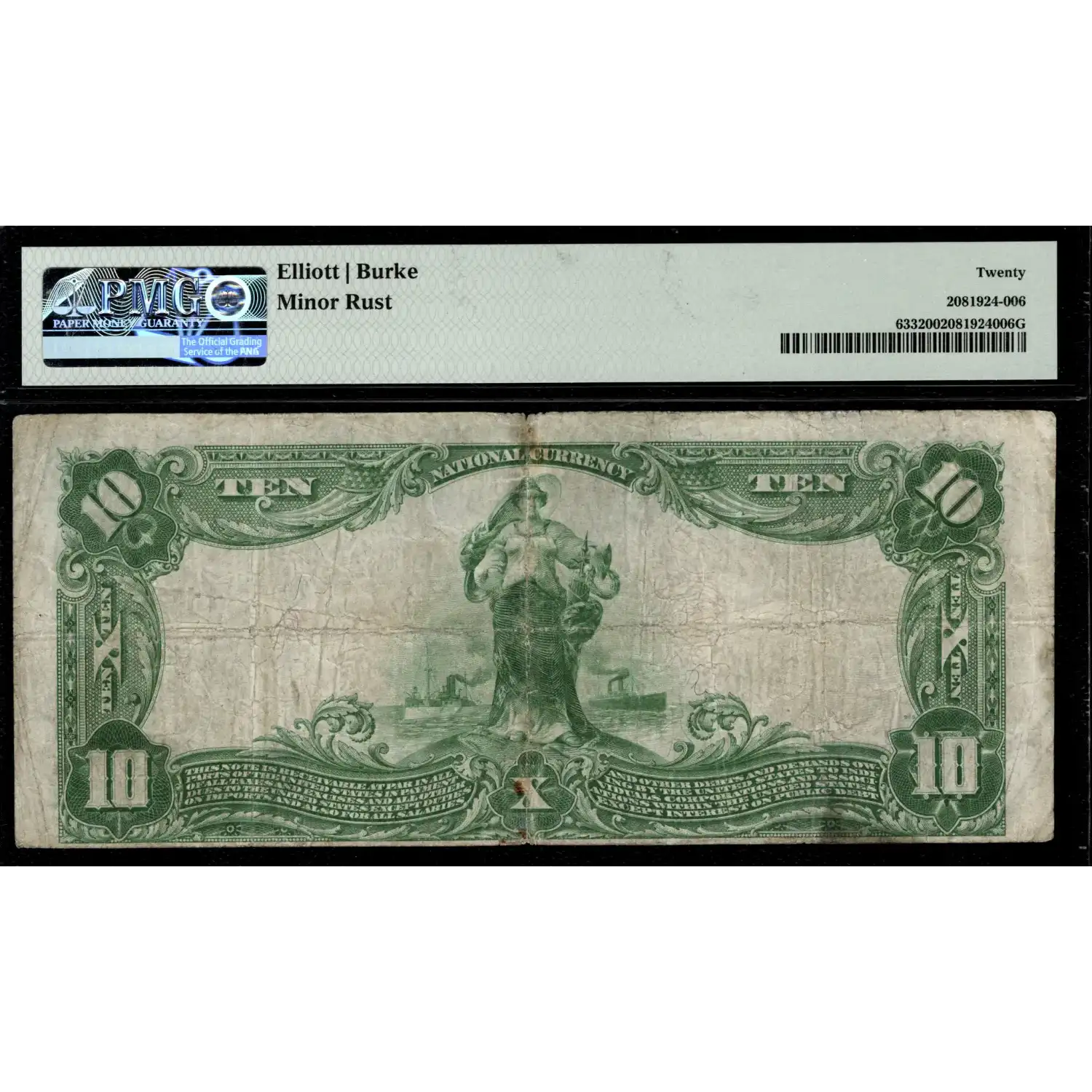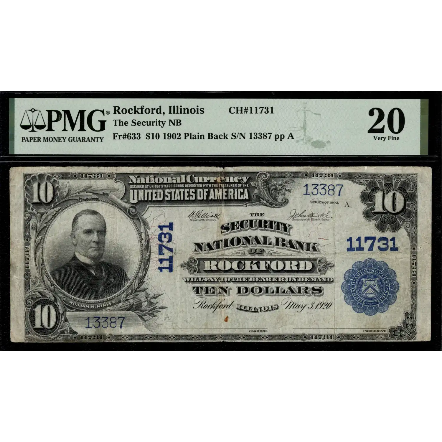 An attractive survivor from this Winnebago County bank, this bright and original $10 saw some light handling and PMG comments minor rust.