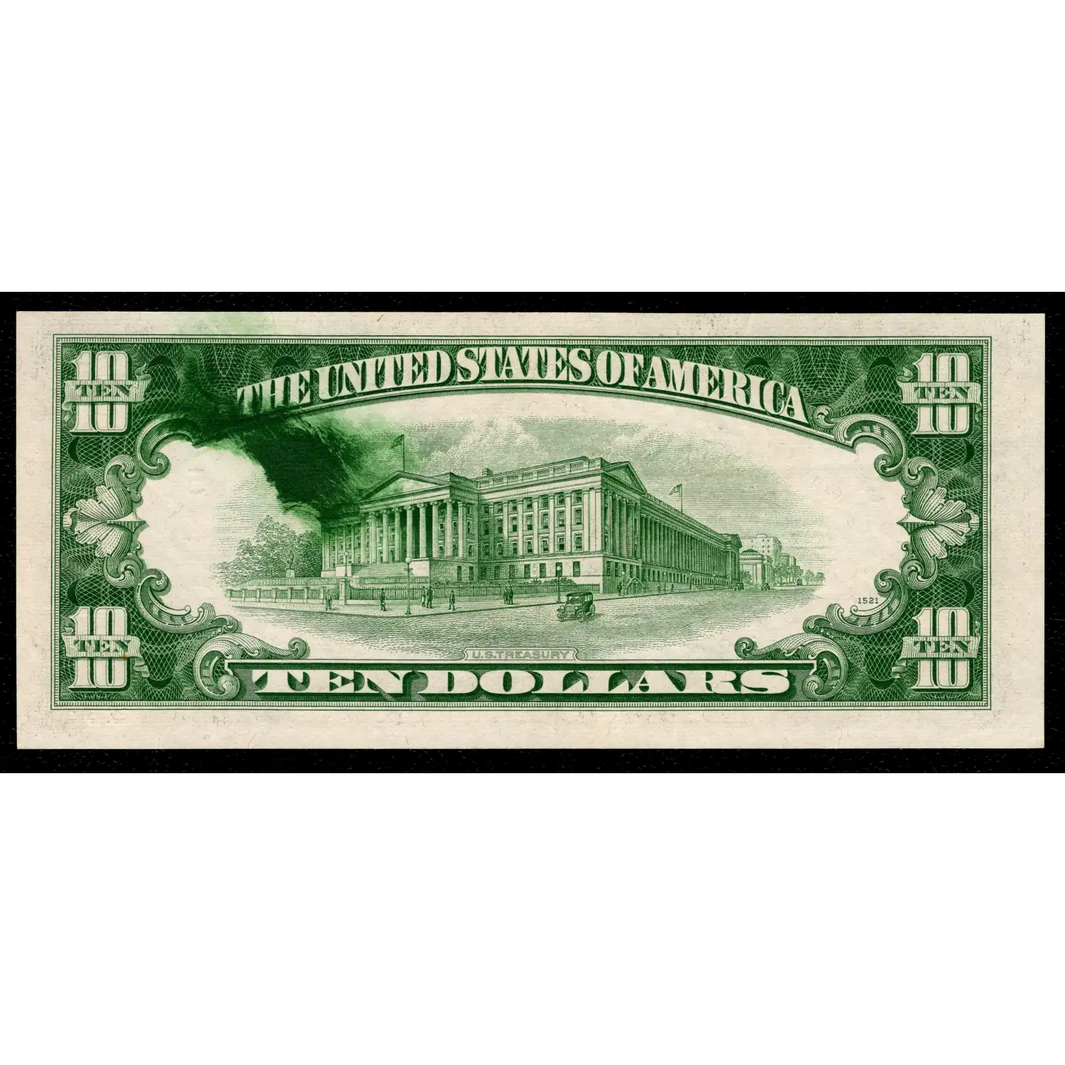 This well-positioned extraneous ink is smearing off the roof and upper levels of the U.S. Treasury giving the illusion there's smoke and flames billowing from the building on this entirely uncirculated and impressively affordable error.