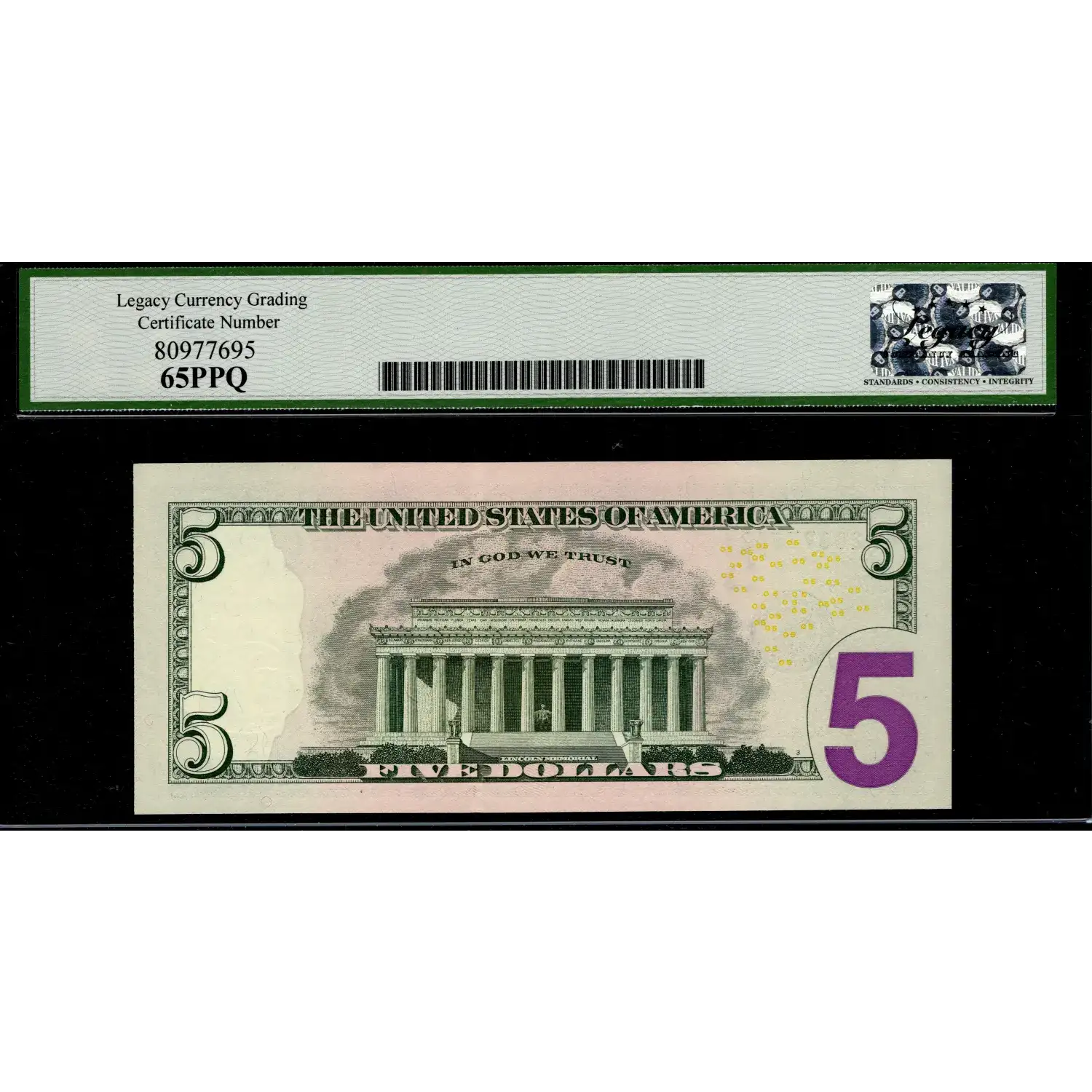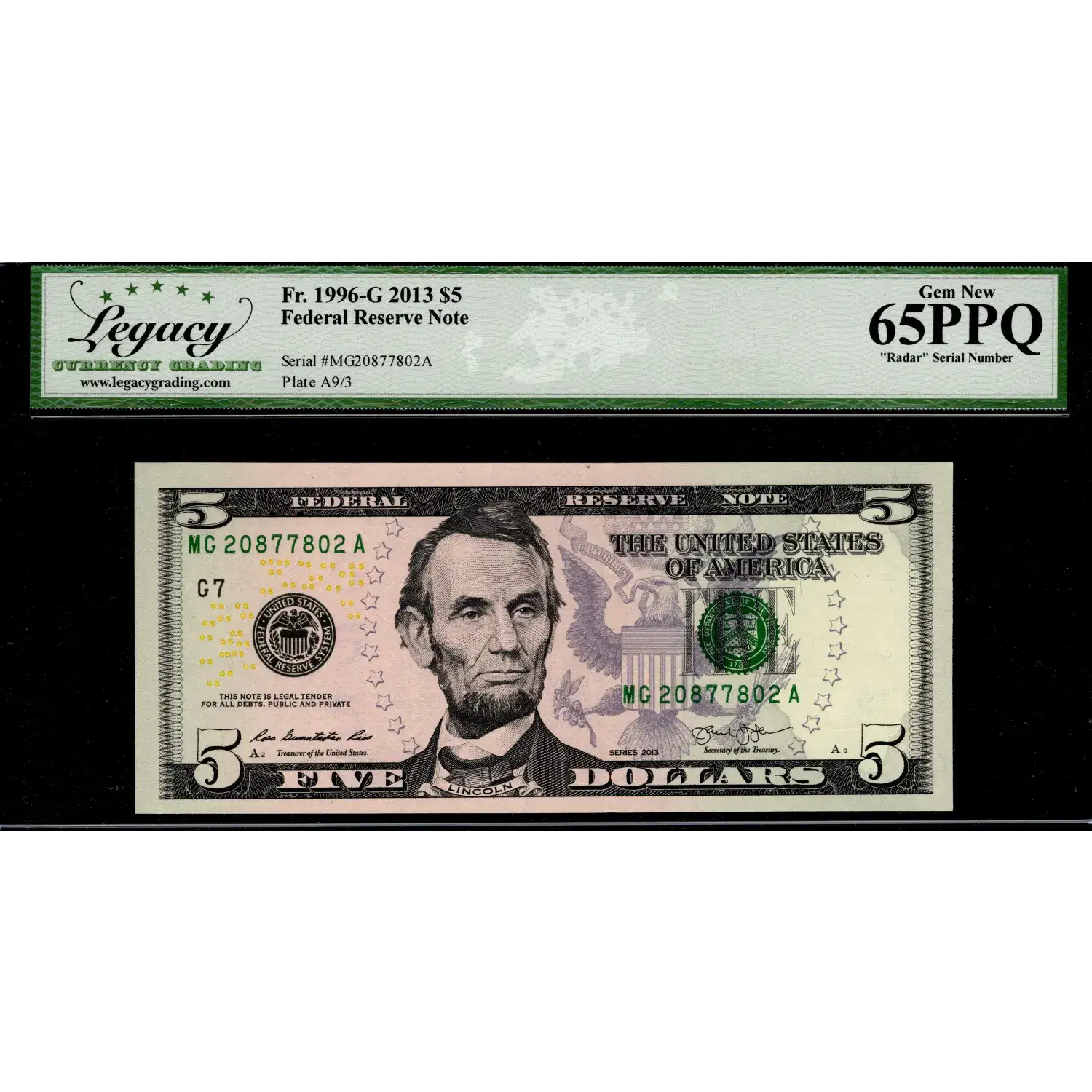 Serial reads identically left to right as it does from right to left on this ultra-high grade colorized five radar note graded Gem New 65PPQ. The note pictured is the exact one you will receive.