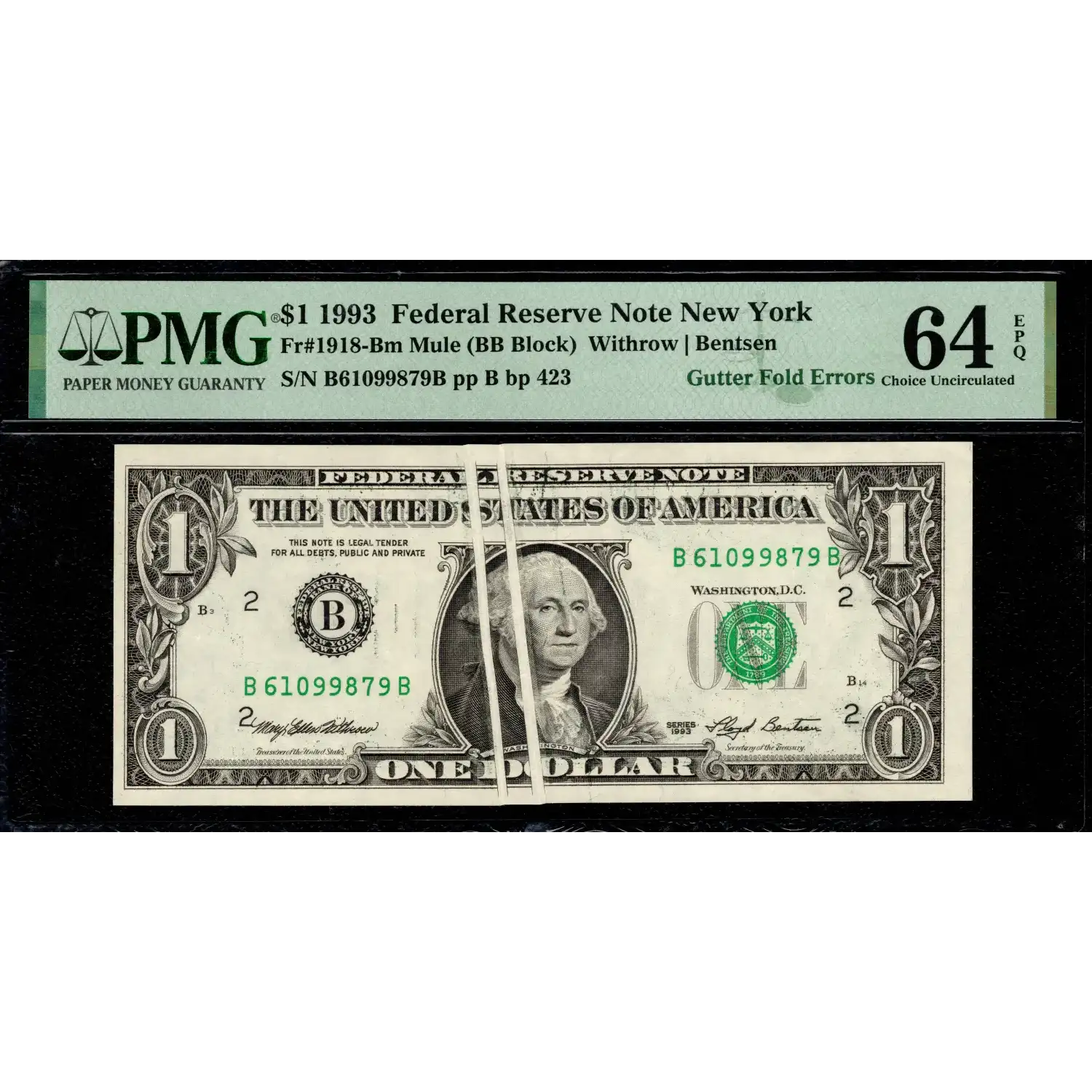 Here's a fun error! There are two paralell gutter folds that span from margin to margin expanding the central portrait of George Washington. As such, we've given this one the nickname of "Expanding Washington."