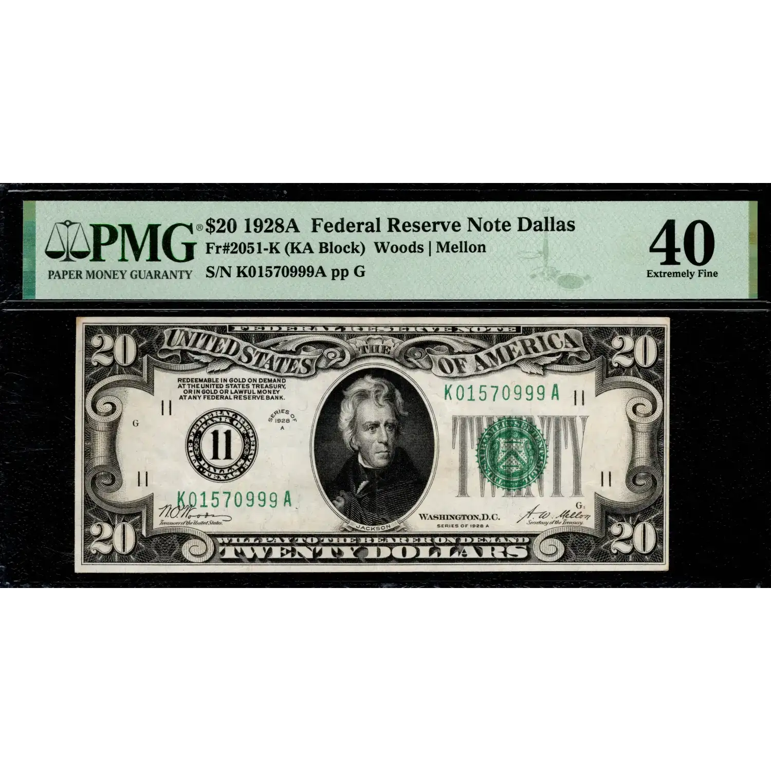 A delightful Dallas Numeral Seal from the 11th District! This note presents exceptionally-well for the grade and bold inks, bright clean surfaces, and terrific eye-appeal from both sides on this always-in-demand "Redeemable in Gold" twenty.
