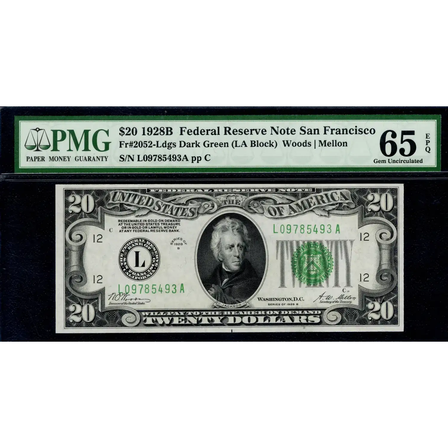 An exceptional and early twenty dollar Federal Reserve Note with the always sought-after "Redeemable in Gold" clause. Generous and even margins along with original surfaces are highlights of this San Francisco Gem! Few notes earn the "full grade" but simply calling it Gem Unc 65 EPQ wasn't enough for this trophy...the graders commented "Exceptional Paper Quality" AND "Great Embossing" on the back of the holder.