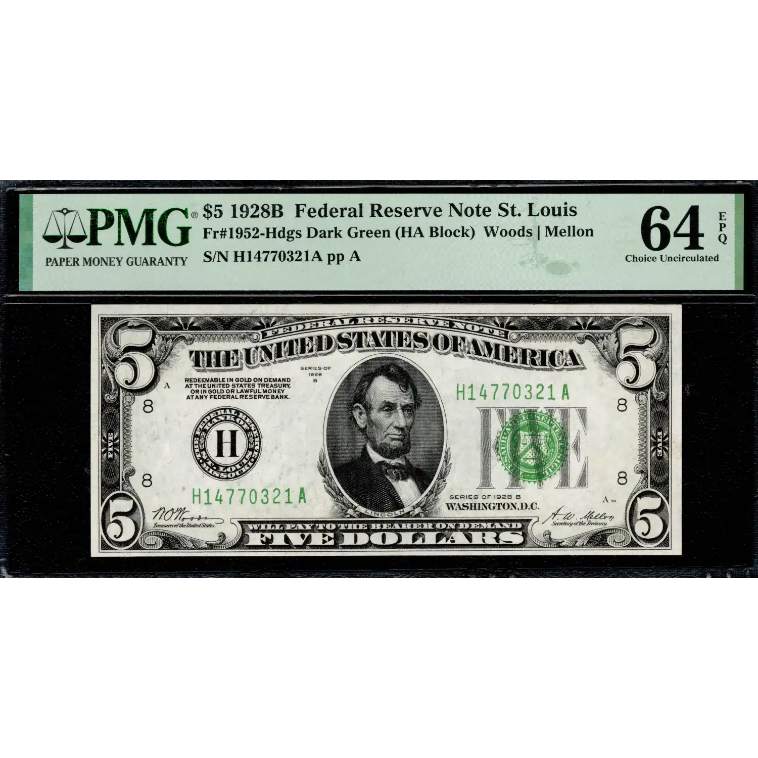 A wonderful example of an early Federal Reserve Note from St. Louis that bears the coveted, "Redeemable in Gold" clause. Sitting one point shy of Gem, its original surfaces, strong embossing, and bold inks easily earned the Exceptional Paper Quality.