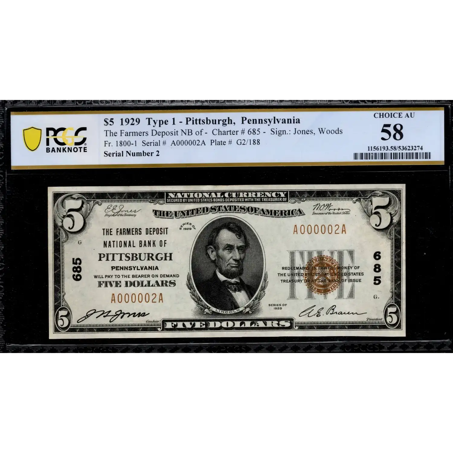Low serial number A000002A adorns this note from The Farmers Deposit National Bank of Pittsburgh, PA identified by Charter # 685. This note is entirely uncirculated less a single corner fold in the upper left back margin that doesn't cross the deisgn. An impressively low single digit serial number, this Serial #2 is an exceptional addition to an existing collection of fancy numbers, fantastic nationals, or simply a opportunity to secure a hometown note from this popular bank.