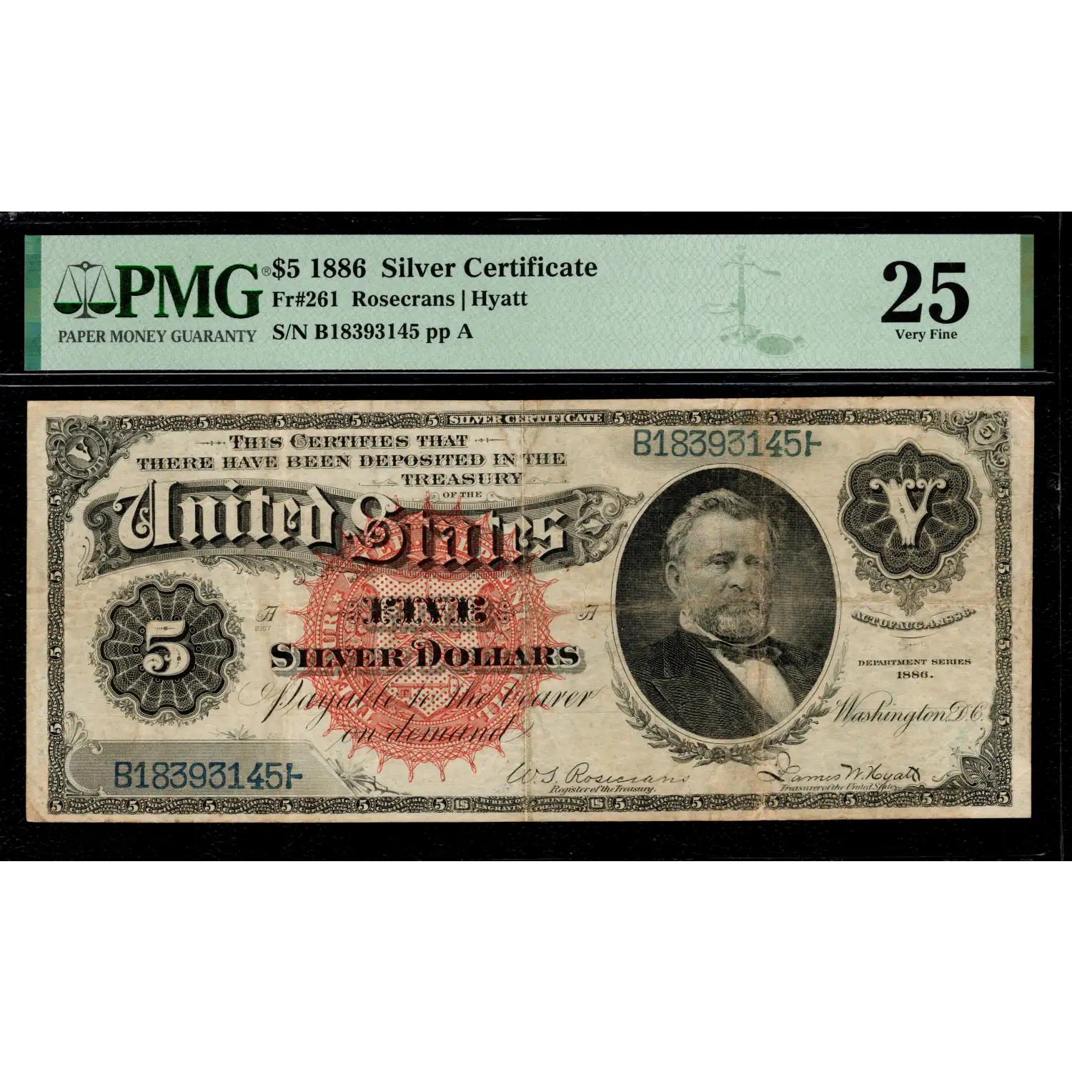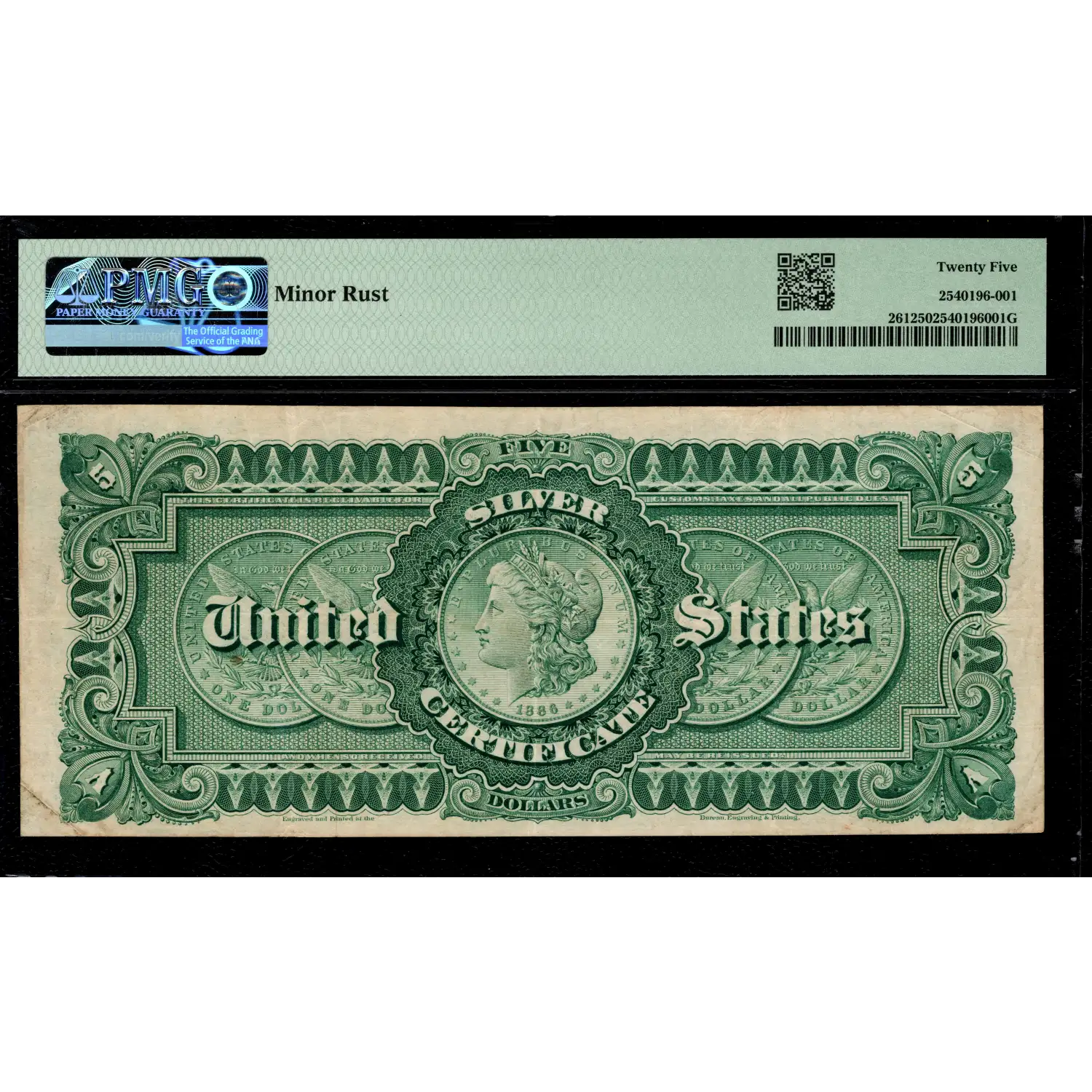 A well-preserved example of an iconic banknote that serves as the perfect intersection piece for coin and currency collectors. This $5 1886 Silver Certificate has the Rosecrans-Hyatt signature combination, large red seal, and portrait of Grant on the face; however, the magic happens when the note is flipped over and five Morgan Silver Dollars are on the back. There's a comment of 'minor rust' for a tiny spot under the "U" in the MSD to the left. It doesn't seem comment-worthy to us, but regardless, it certainly doesn't distract from the beauty of this iconic Morgan Silver Dollar Back!
