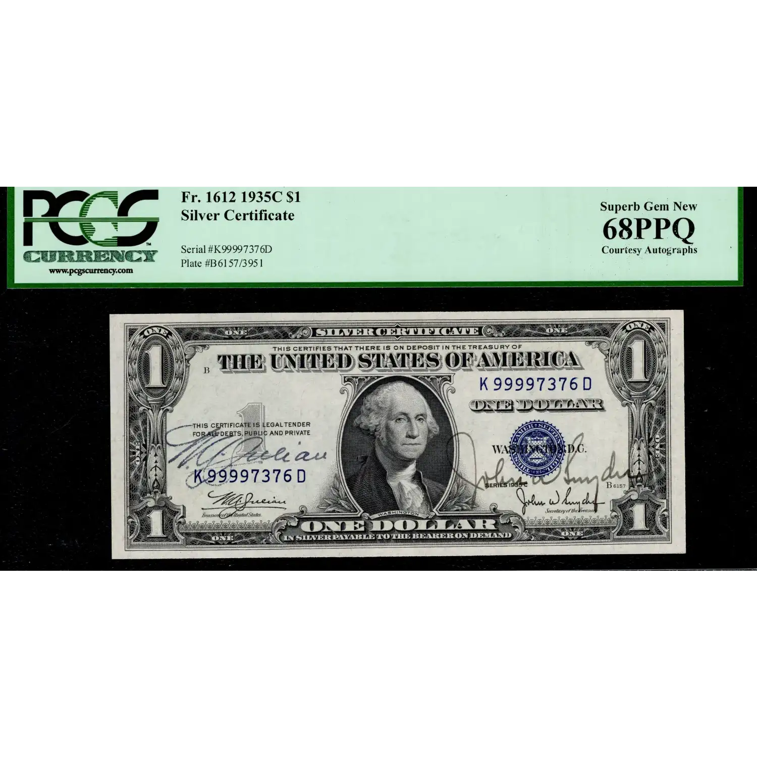 A near-perfect example, this early $1 Silver is not only from the very rare K-D block with a printing of a mere 4,000 notes for this series, but it also bears the well executed autographs of both Treasury officials, Julian and Snyder. Sitting in an impressive PCGS Superb Gem New 68PPQ holder, all that's left is to congratulate the next owner of such a terrific piece.