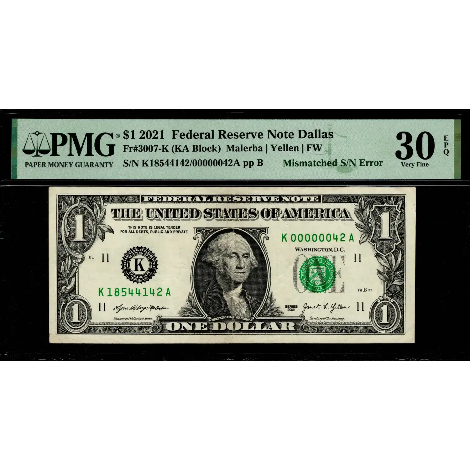 A dramatic mismatched serial number is seen on this Dallas $1 where the left serial number reads K18544142A and the right serial reads K00000042A. This mismatched serial number includes six different digits, which is elusive in itself, but this example has a mismatched serial number where for one of the serial numbers all six digits are zeros. This makes for one striking example of this error type.