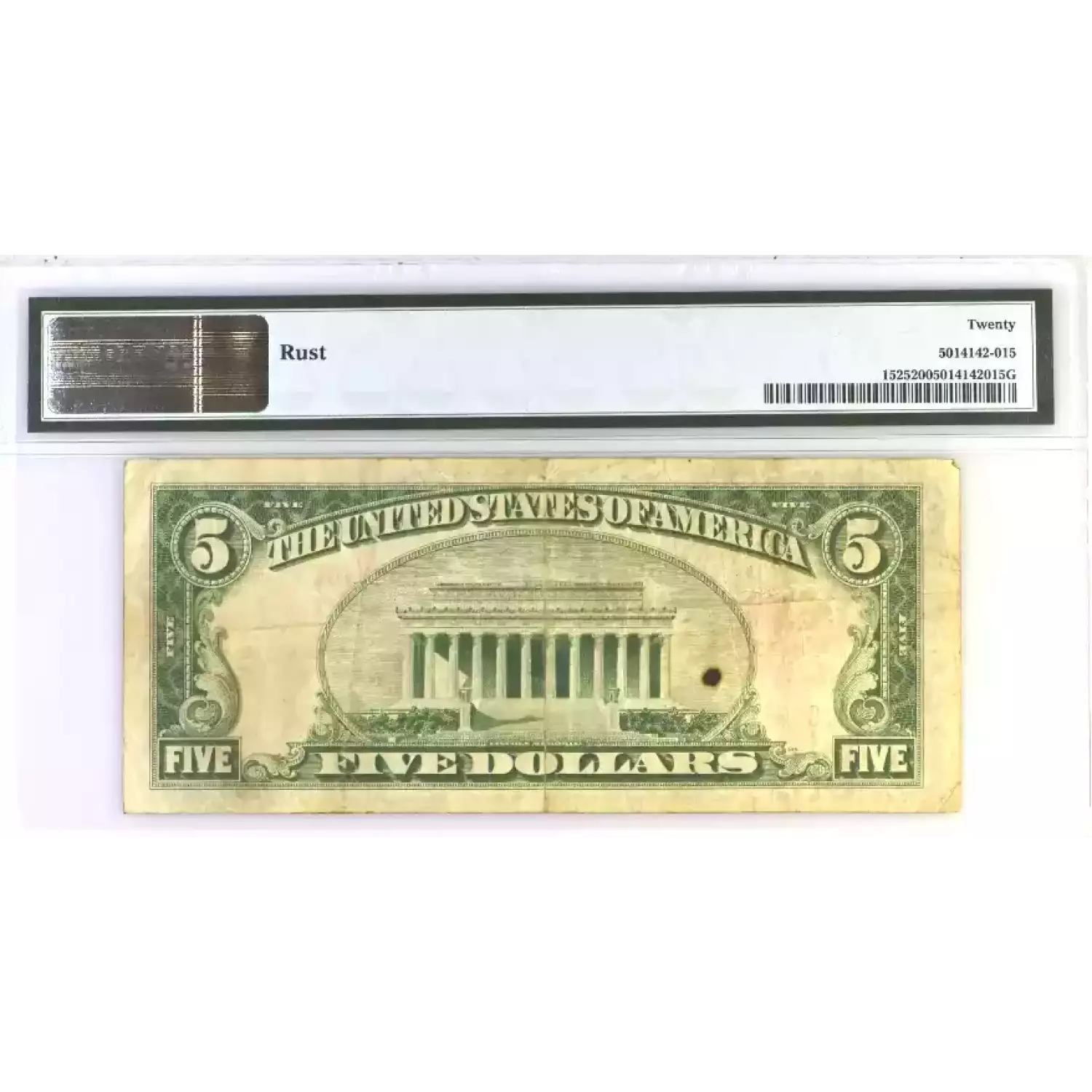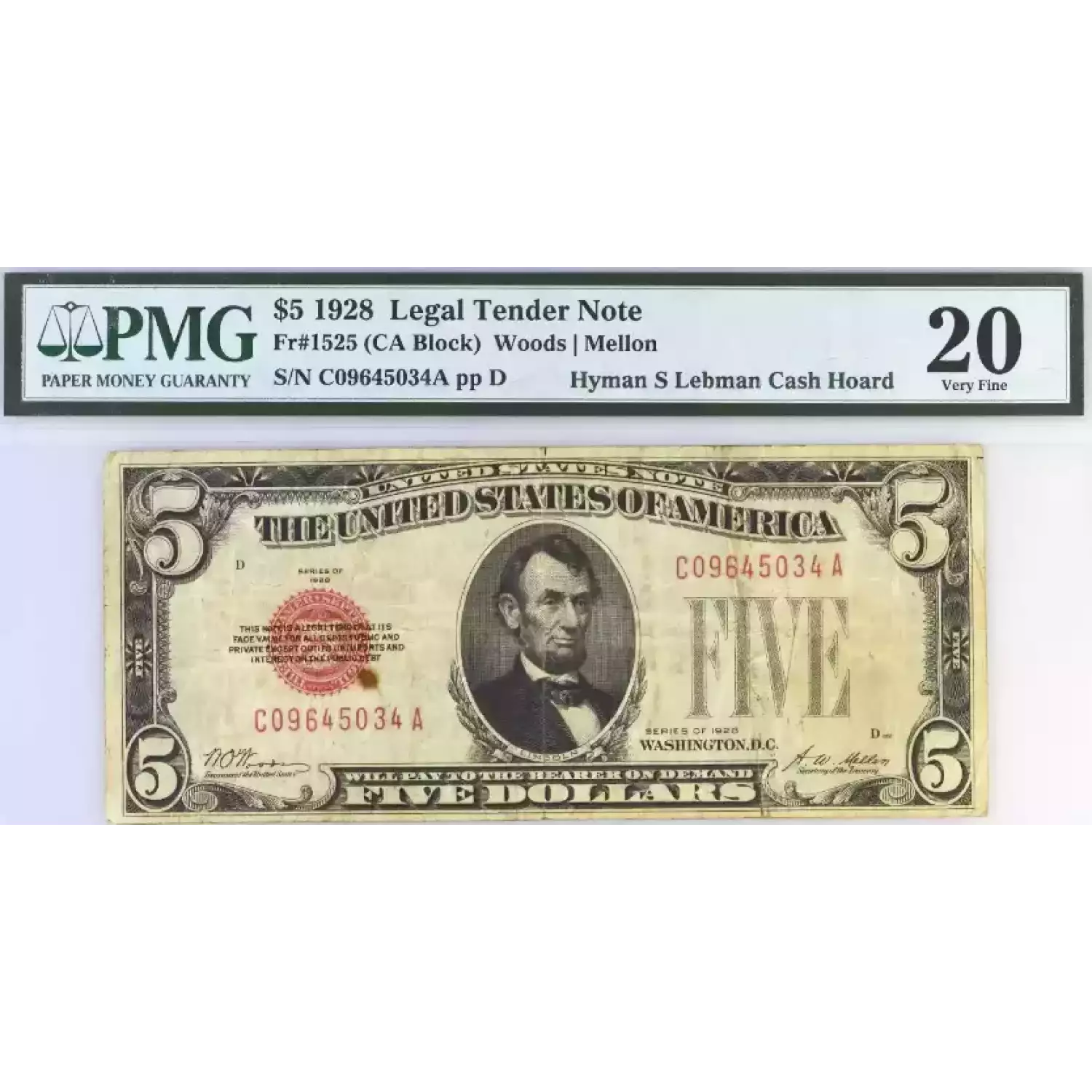 $5 1928 Legal Tender Fr.1525 from =BABY FACE NELSON CASH HOARD= Public Enemy Number One PMG Very Fine 20