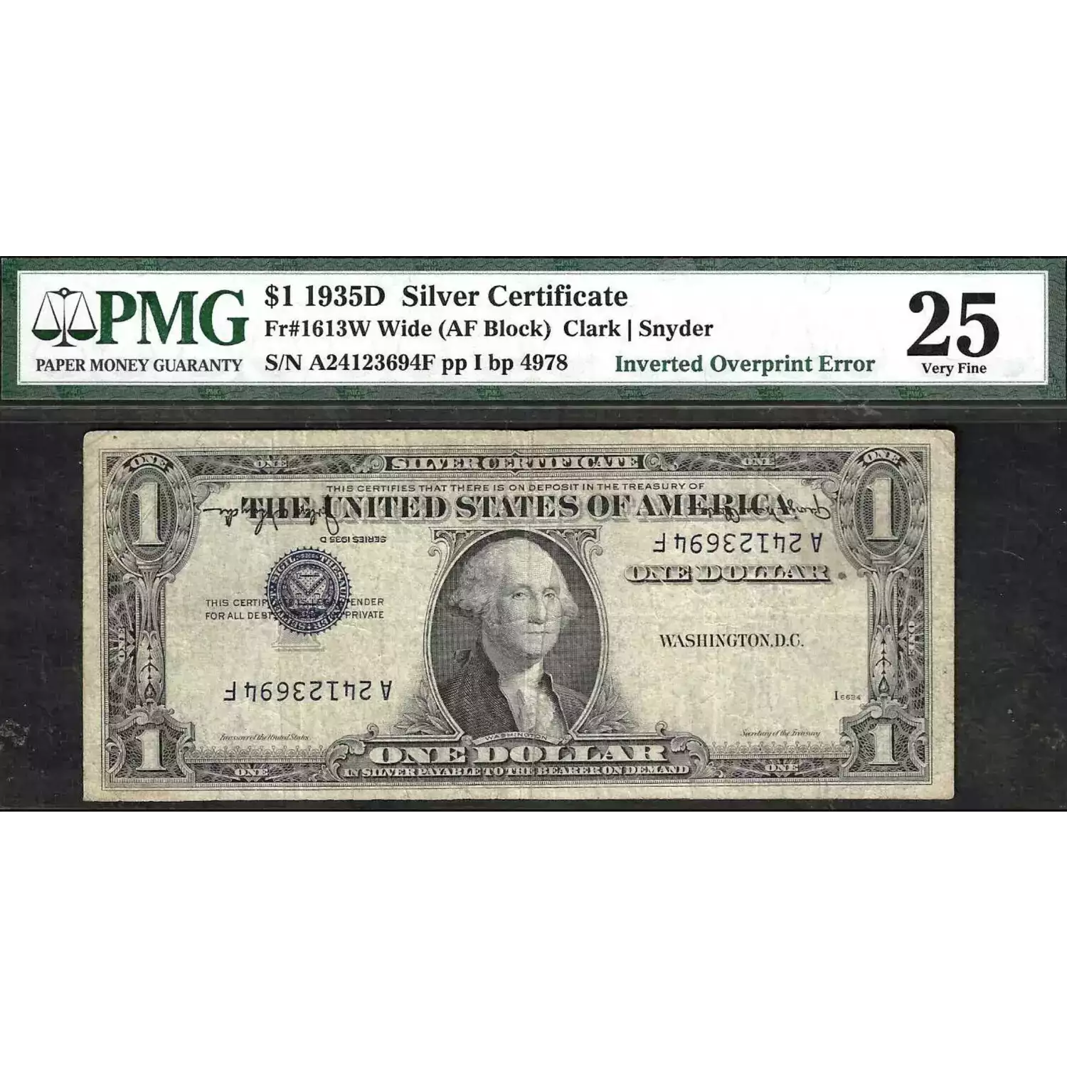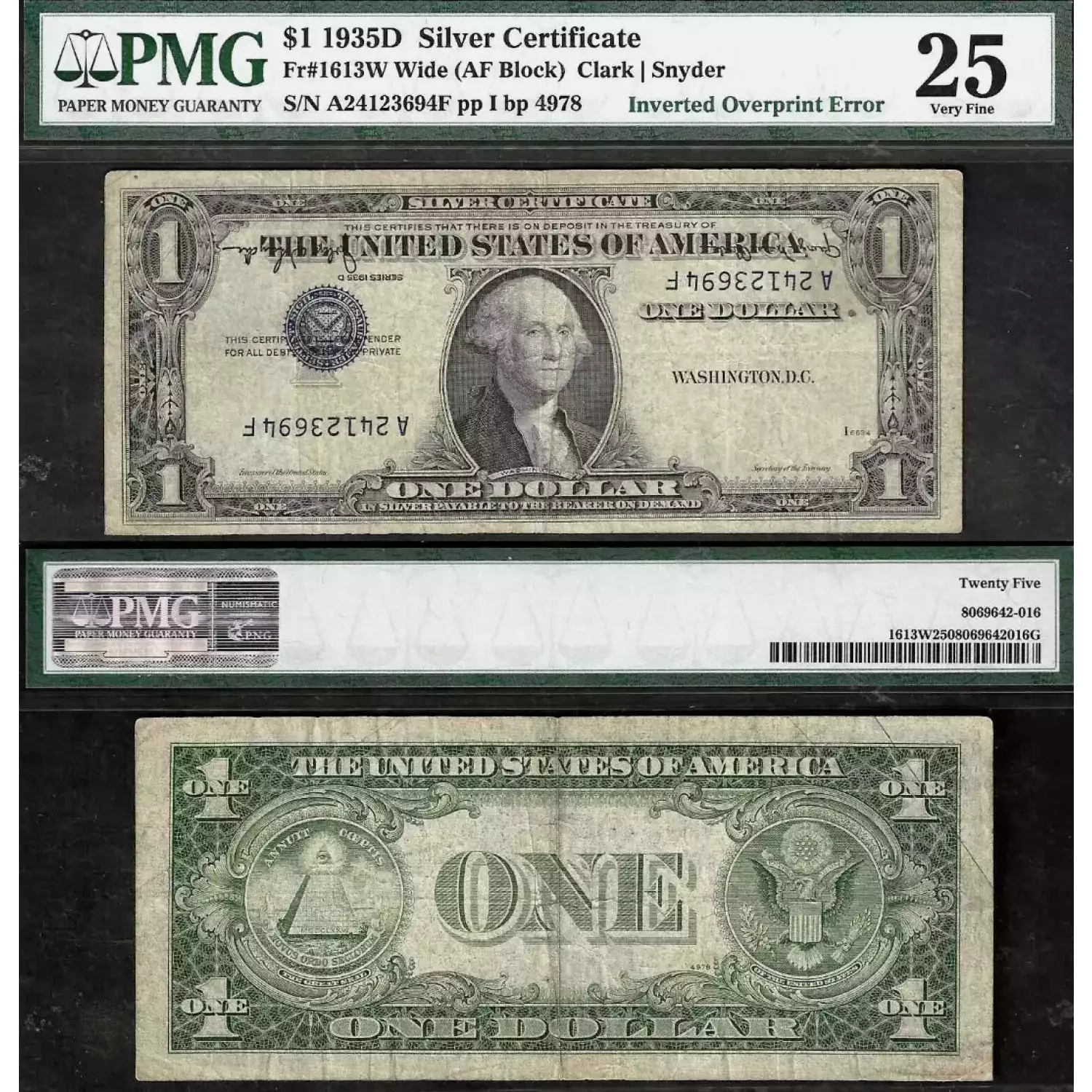 $1 1935-D Silver Cert Inverted Overprint Blue Serials+ Seals Upside Down PMG VF 25