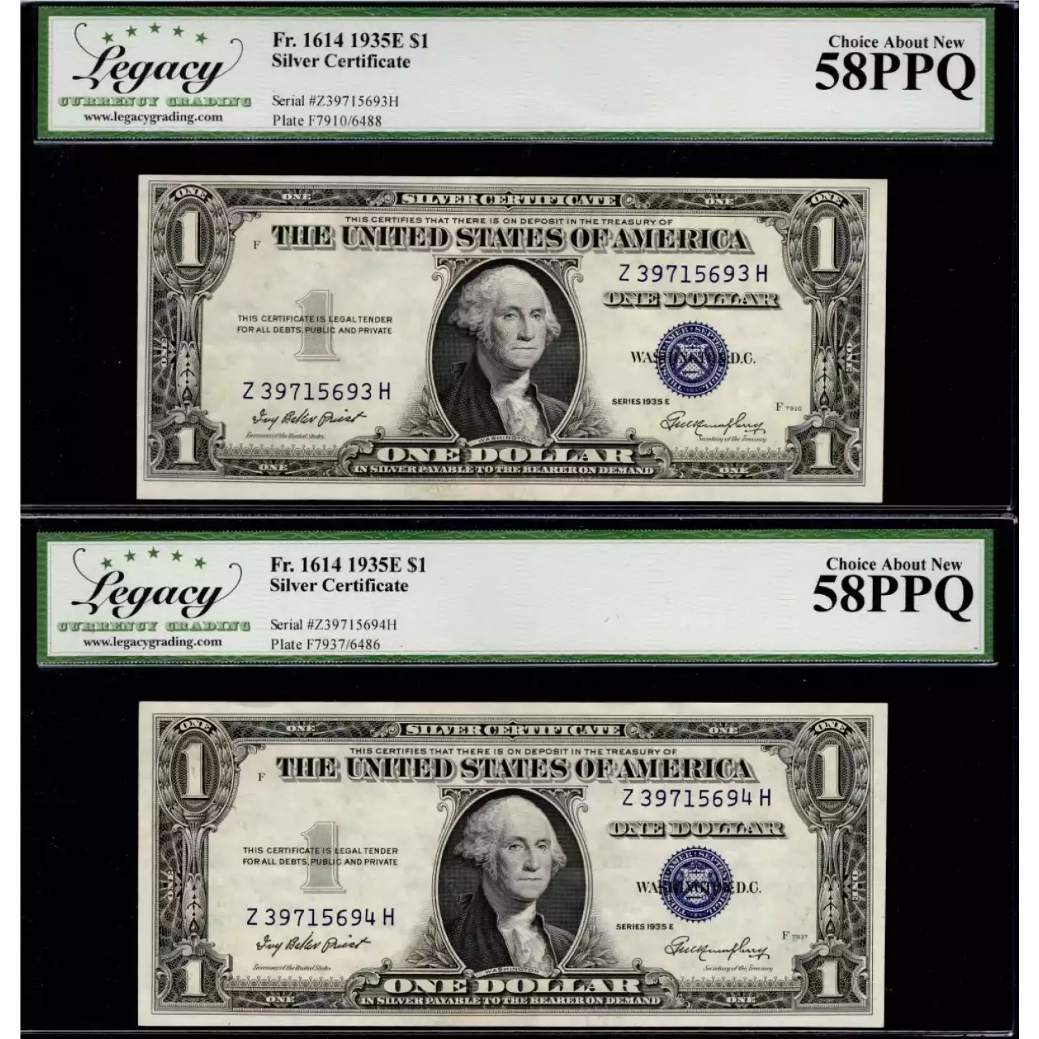 A stunning consecutive pair of $1 1935-E Silver Certificates featuring the signature combination of Ivy Baker Priest and Humphrey. These sequential notes showcase the Z-H block and have been preserved in exceptional condition with original surfaces and encapsulated in a high-grade holder for generations of protection and enjoyment.