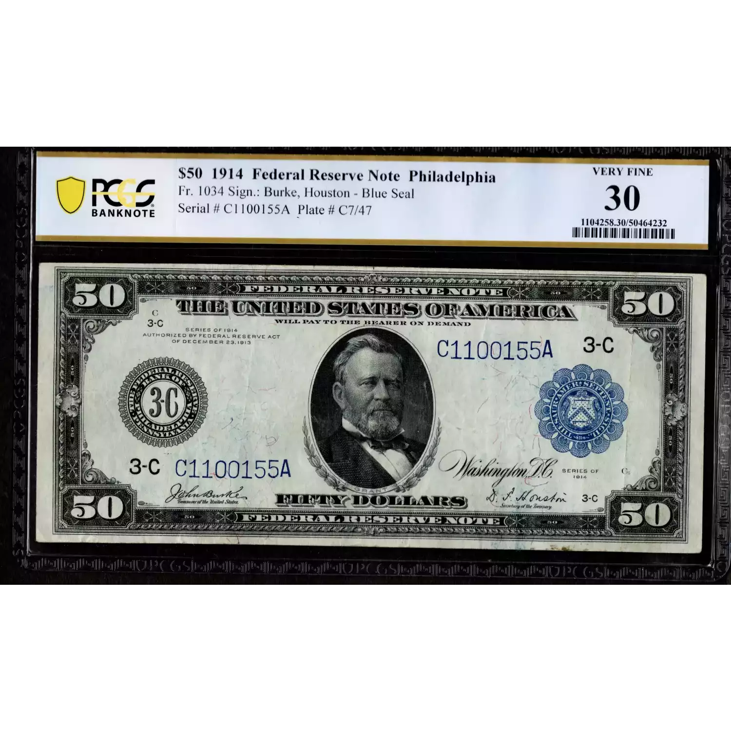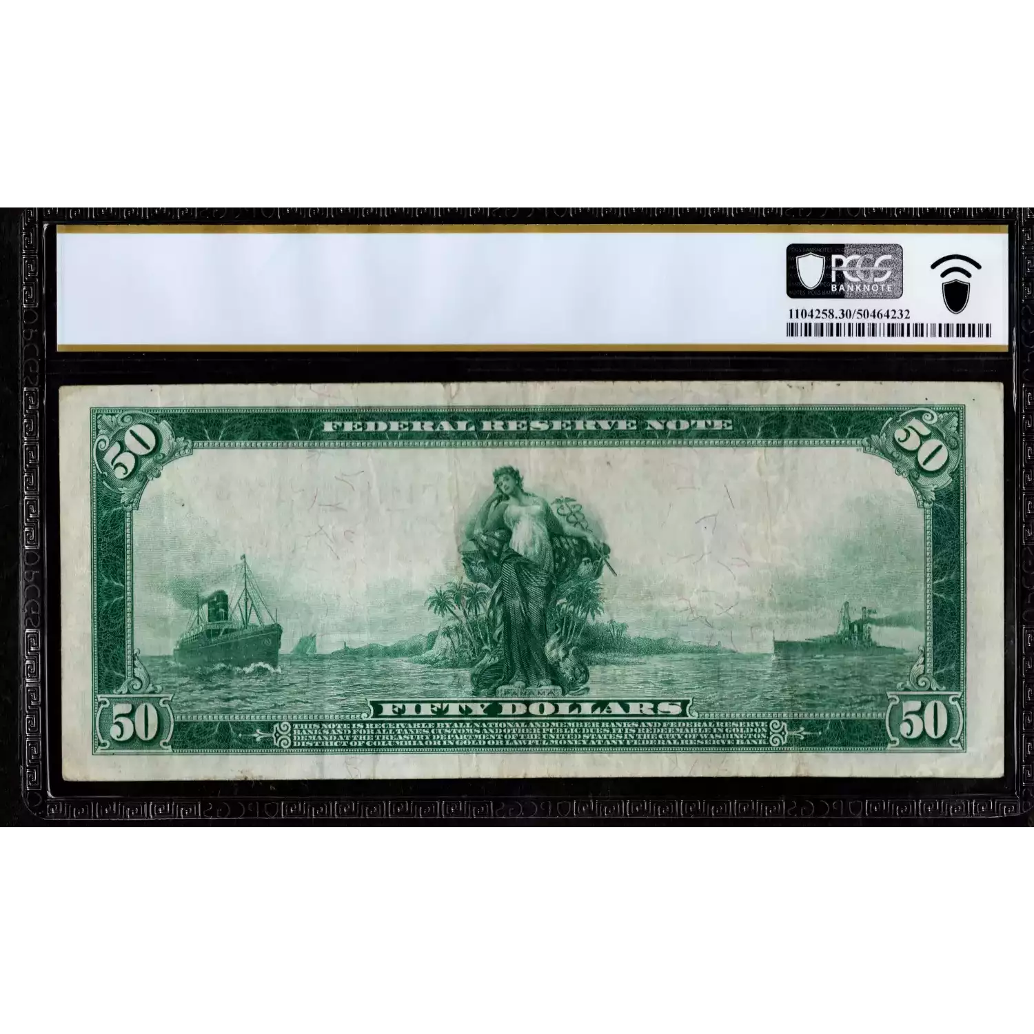 A fairly scarce Philadelphia district $50, this piece is especially desirable in this attractive grade. Of the 125 examples enumerated in the census, none have received a CU grade from either service. This nicely margined and sharply inked example has been preserved with incredible eye-appeal and is offered at an attractive price with free shipping when ordering directly from Executive Currency!