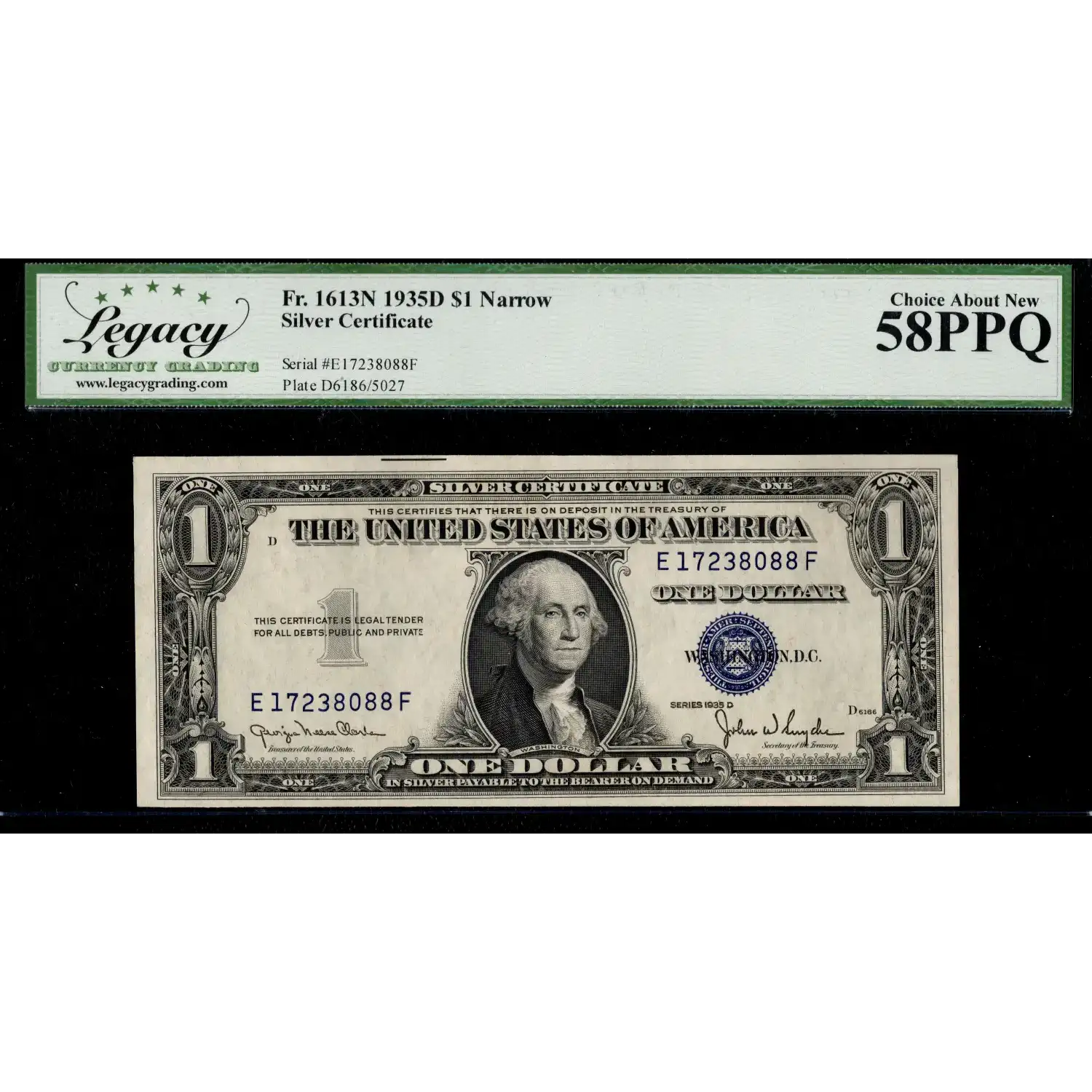 To determine if a $1 1935-D silver certificate is "wide" or "narrow," look at the space below the "ONE DOLLAR" on the back of the note; a wider gap indicates a wide variety, while a smaller gap signifies a narrow variety; you can also check the back plate number, with numbers below 5015 generally being wide and numbers above 5017 being narrow. This particualr example is a Narrow $1 1935-D Silver Certificate from Back Plate #5027 and has exceptional eye-appeal with even margins and original surfaces.