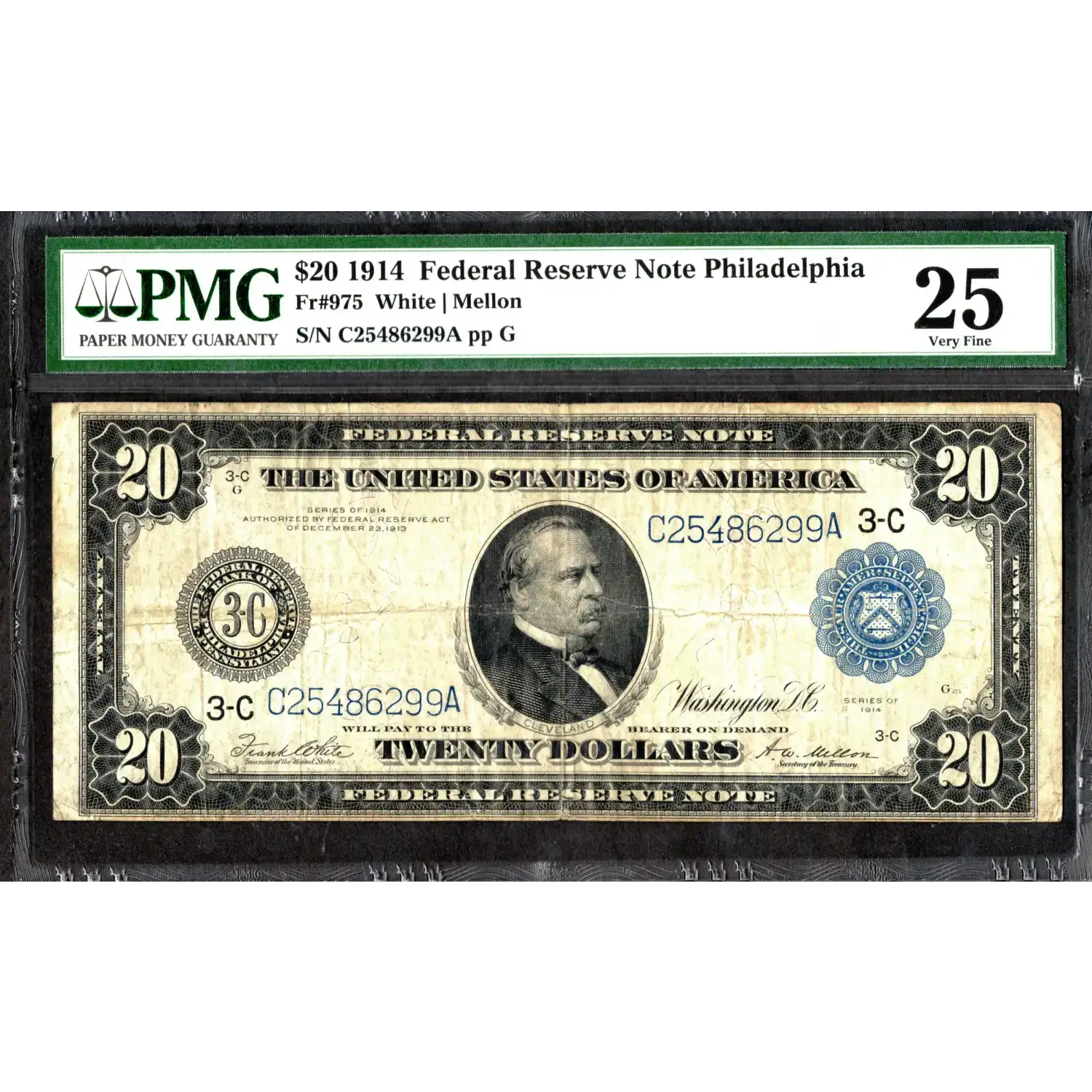 This White-Mellon note is an "a" variety. Friedberg does not list it as such since there are no "b" and "c" varieties for this number. Even circulation is observed on this blue seal Philly $20 Federal Reserve Note that's entirely free of any problems or comments.