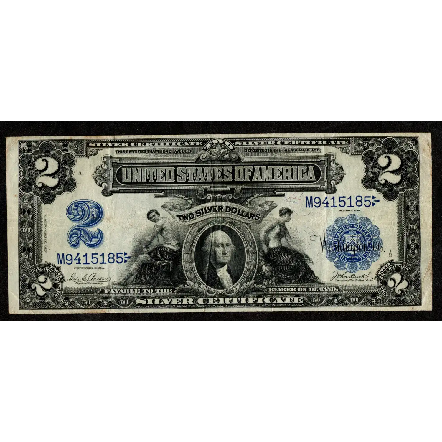 An attractive and iconic Mechanics and Agriculture Deuce that's often referred to as a "Mini-Porthole" in reference to the $5 1923 Silver Certificate nicknamed the "Porthole." This note faces up quite well and has the signature combination of Parker - Burke. An exciting opportunity for a large size collector!