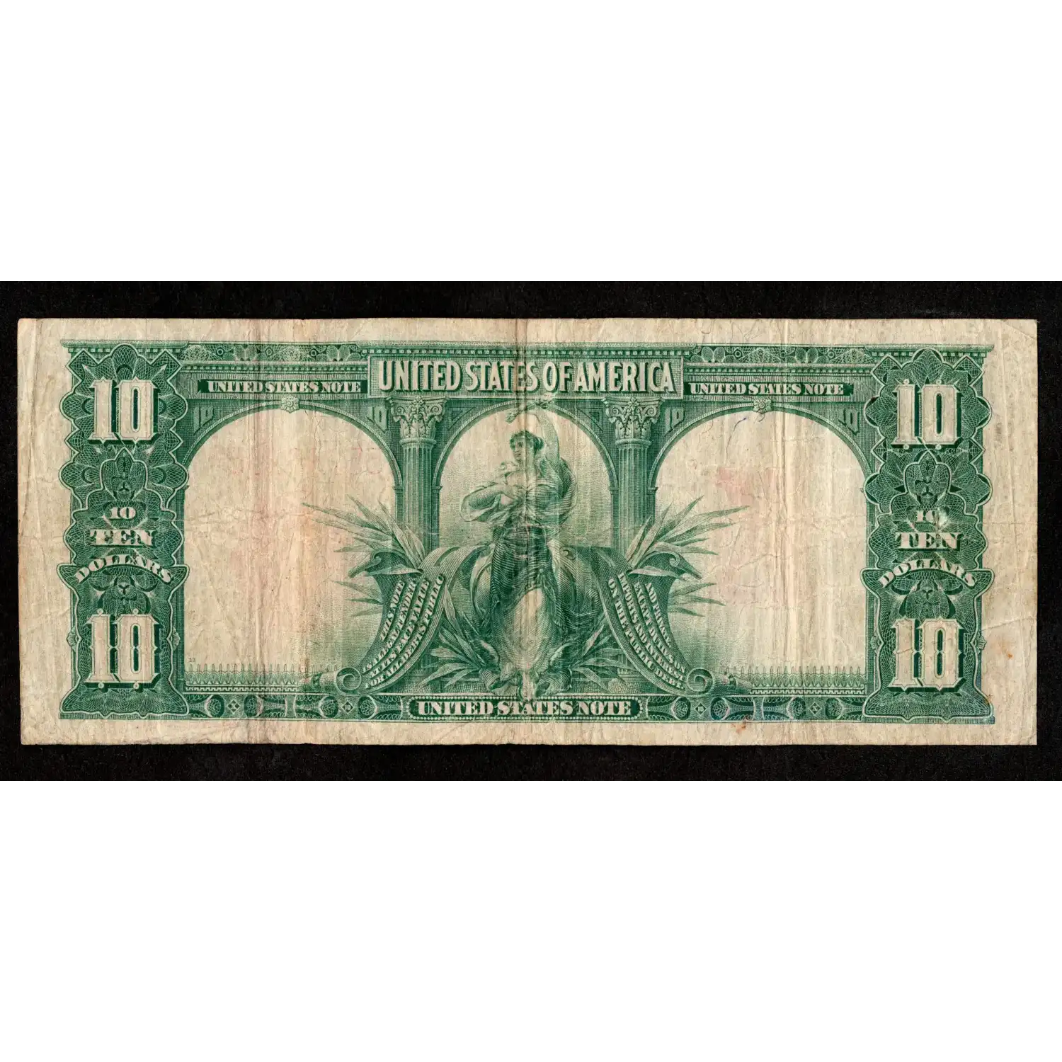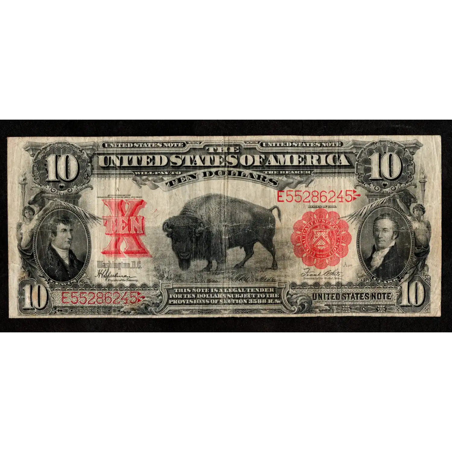 An attractive and problem-free example of an iconic design that belongs in every large size collection of US Paper Money! This $10 1901 Legal Tender "Bison" note features Lewis and Clark on each side of the face near the vibrant red overprint. Many come with severe probelms such as rips, writing, stains, and ugly bleedthrough of the overprint onto the back, but we're pleased this note has been preserved in ideal collector condition and entirely free of problems allowing us to offer a note at the perfect intersection of attractive and affordable.