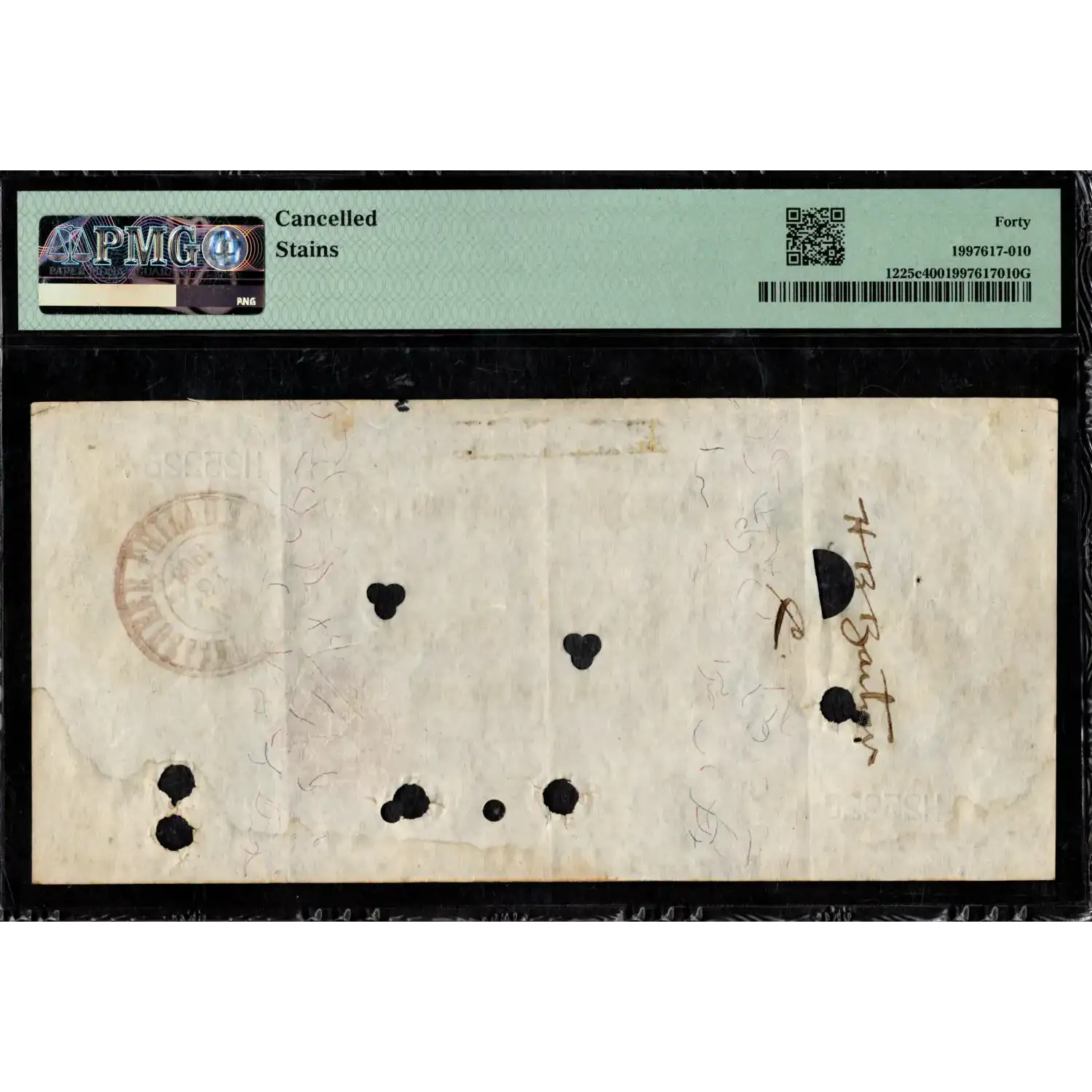 An exceptionally clean XF note with paper originality that hails from a tougher Friedberg number for this unredeemable note. Fr. 1225c is often found payable to a national bank. In this case it is the Farmers & Mechanics National Bank of Philadelphia. The note does have the usual hole punch cancels, as that was the fate that awaited all examples of this design with the Vernon-Treat Treasury signature combination along with the comment of 'stains' as a poignant reminder of the time this spent in a blazing fire before being doused by fire hoses and saved and preserved for collectors to appreciate.