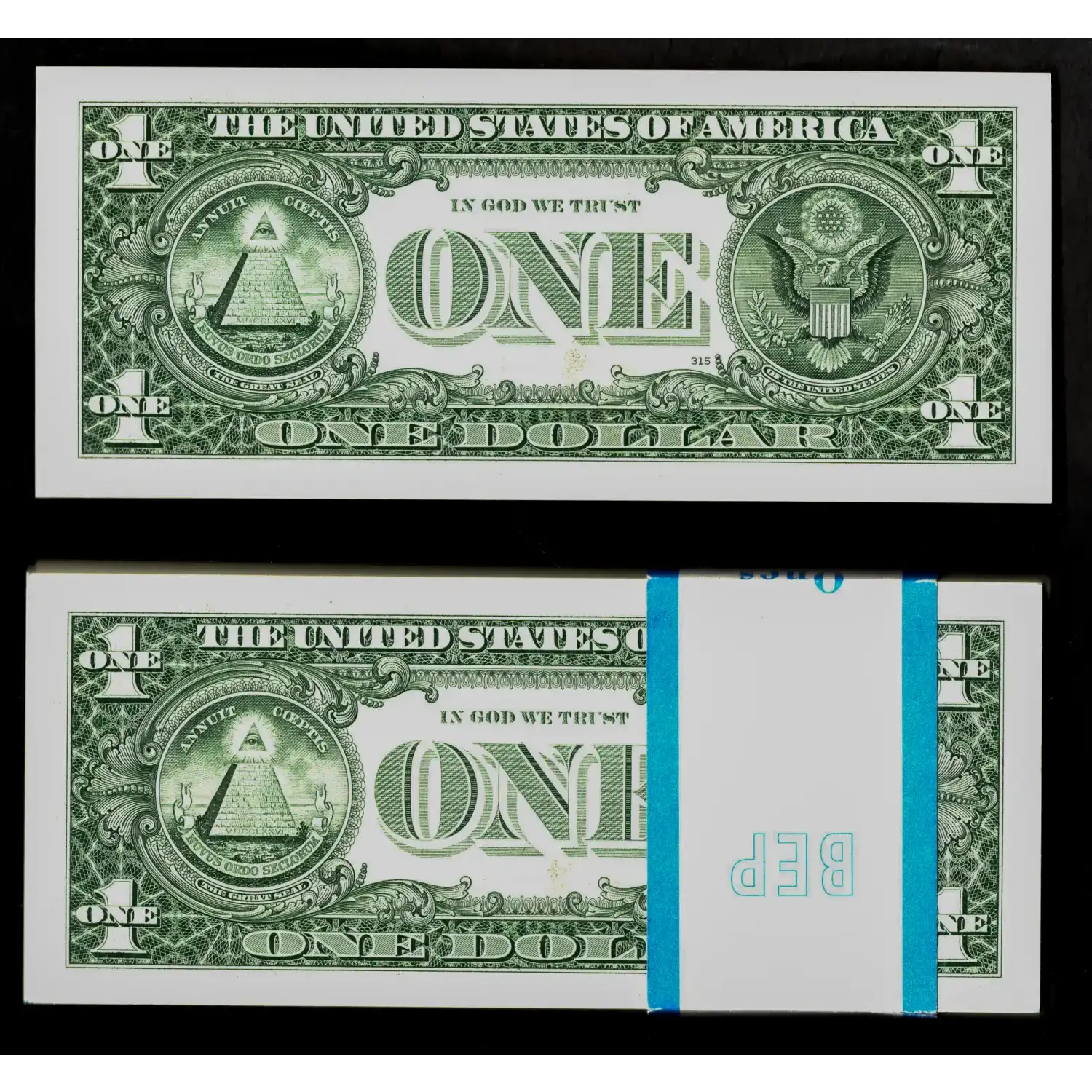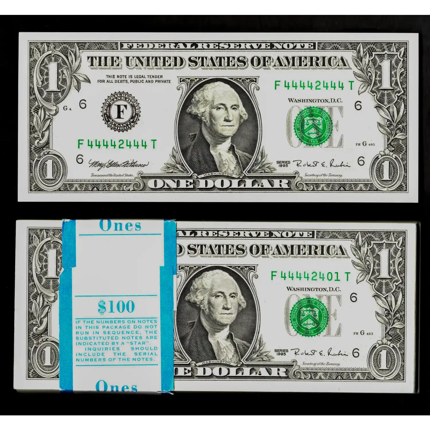 A fully original pack of $1 1995 Federal Reserve Notes from Atlanta. This pack features 100 consecutive notes still bound by its original BEP strap; however, 44 notes inside lies a fancy serial number treasure that adds to the excitement of an already exciting pack!