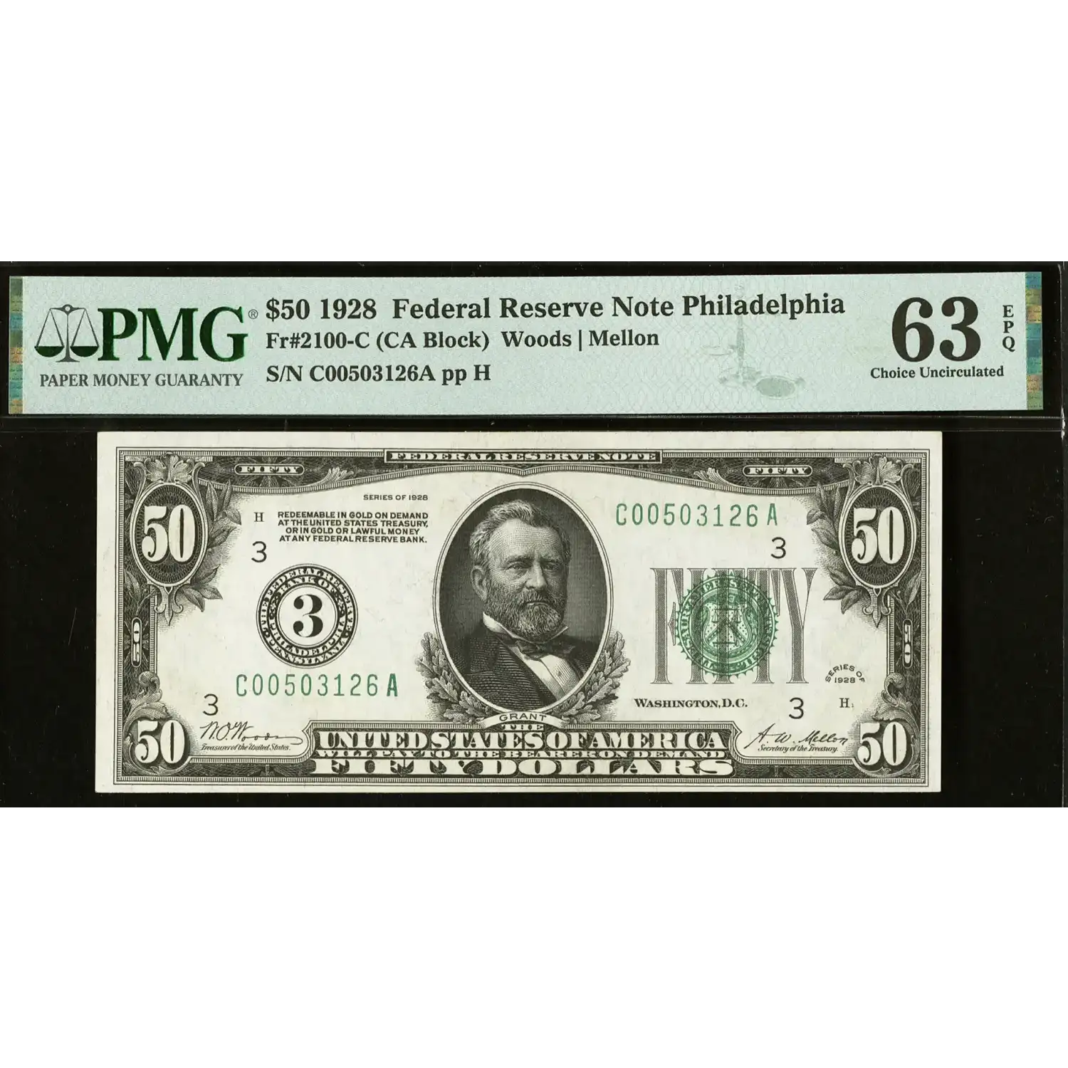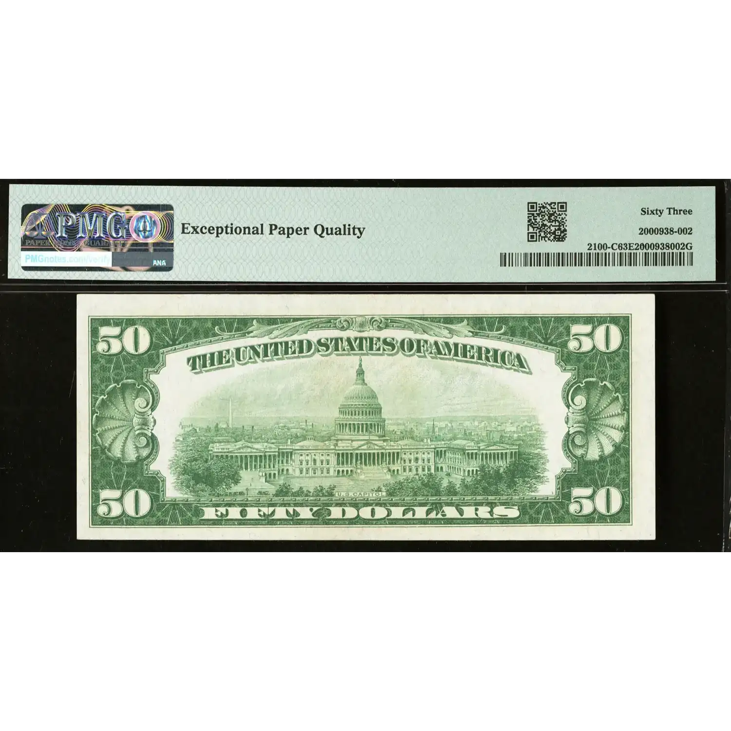 A crackling fresh and fully original numeric district Philadelphia $50 that is only held back from a higher grade by its centering. The last public sale was in April 2025 when another example of this note in a PCGS 63PPQ sold for $720. We can't always beat the last public sale, but we're pleased to offer this one for less. Numeral seal fifties in high-grade aren't as readily avilable as one might think; enjoy this opportunity.