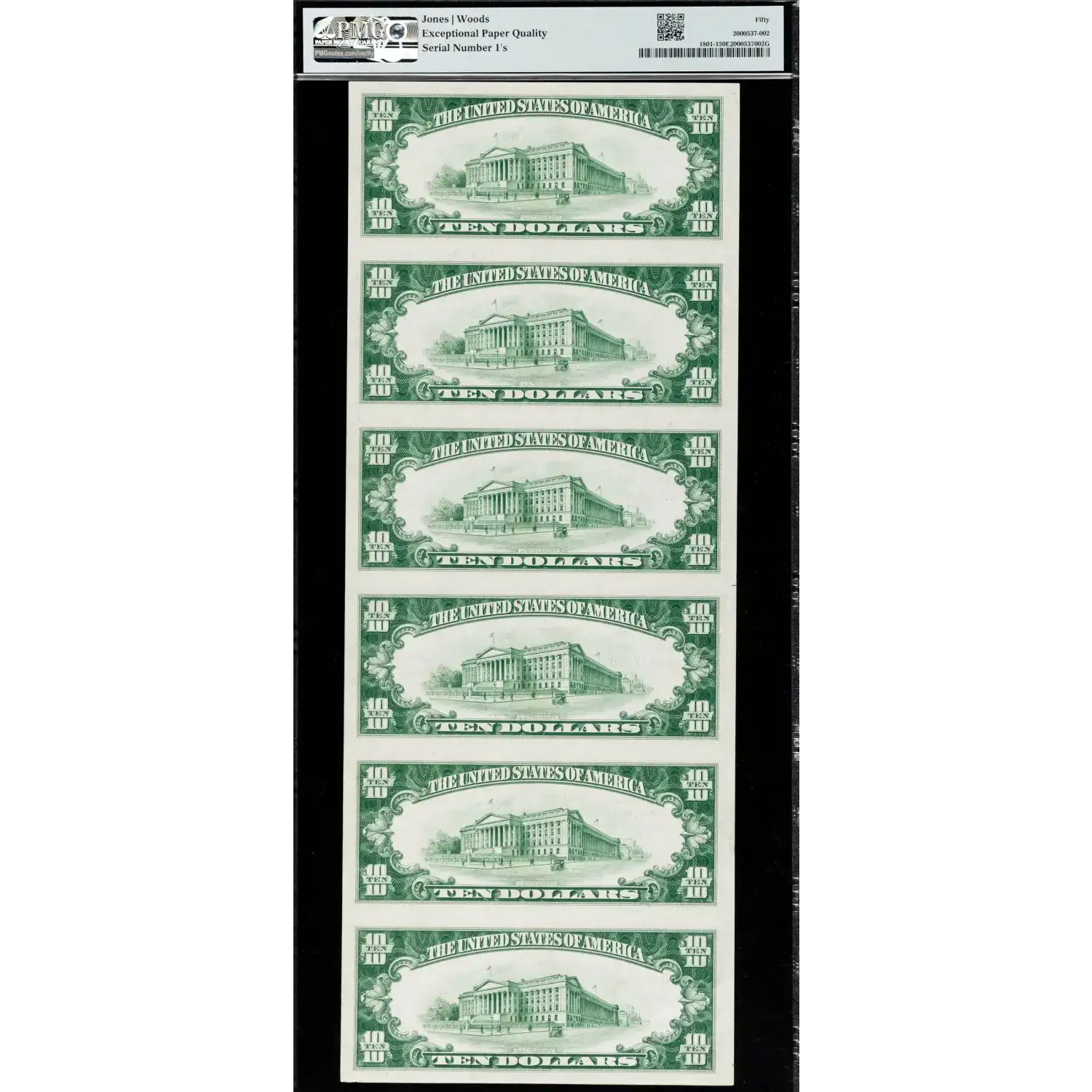 This very attractive all-Serial Number 1 uncut sheet comes from a popular Florida bank and is making its market debut. Representing the first sheet of Type 1 $10s issued by this late-chartering Polk County institution that released small size notes only, this uncut sheet has some minor handling, but maintains bold ink colors and fully original surfaces. This is the first Number 1 note of any kind from this charter to appear on the market in almost 15 years. That last occurrence was in a Heritage Sale in 2011 when an indivdual serial number one on a Type I $20 brought nearly $3,000.