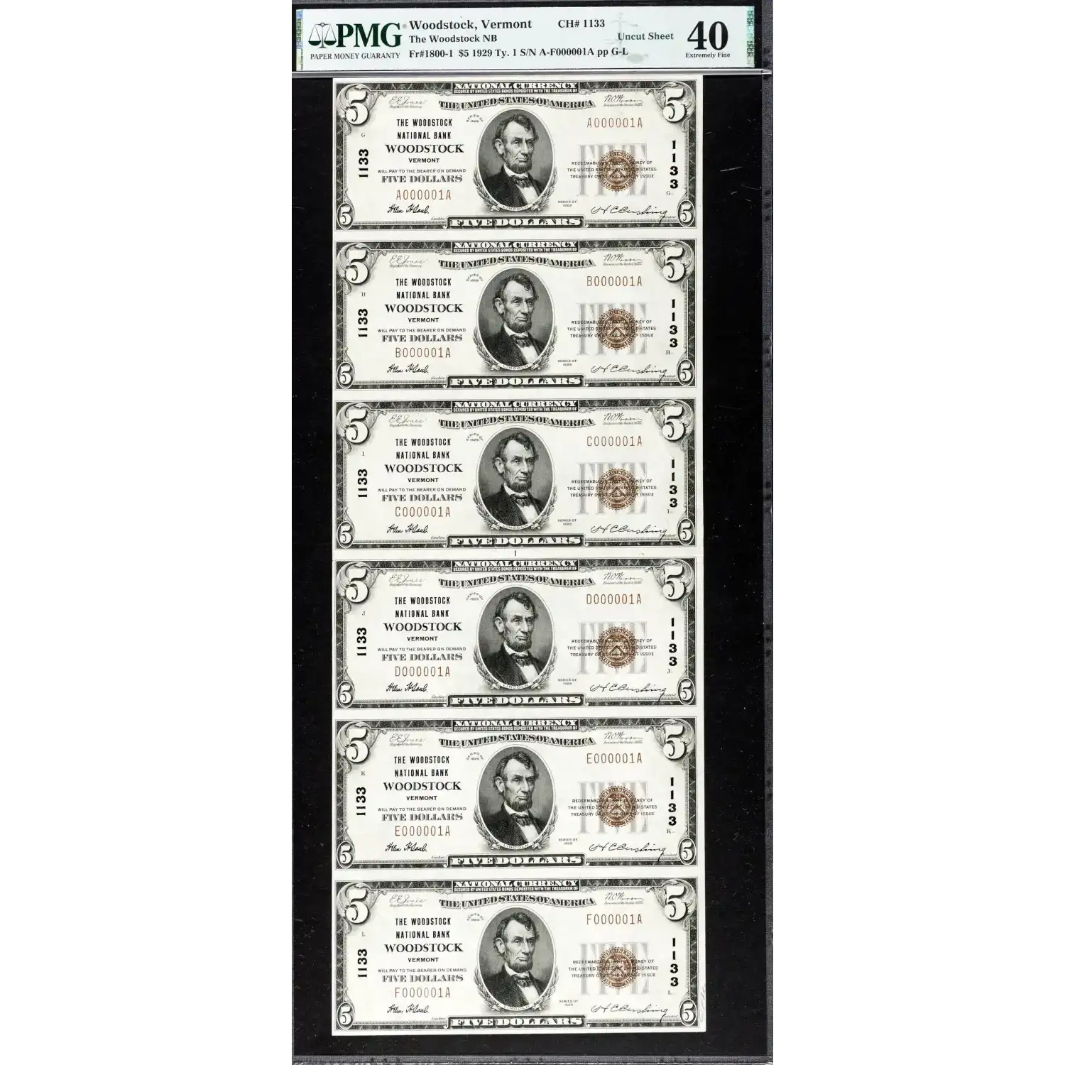Serial Number 1 Woodstock, VT - $5 1929 Ty. 1 The Woodstock National Bank Ch. # 1133 Uncut Sheet PMG Extremely Fine 40.